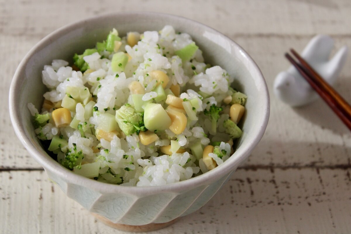 バターで炒めたブロッコリーとコーンを白飯に混ぜた、子どもに人気のご飯もの。バターのコクで青臭さが気になりません。