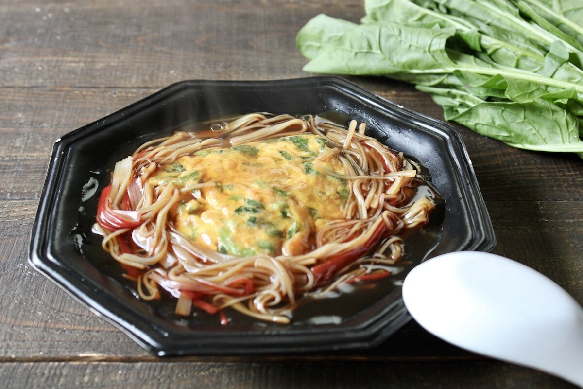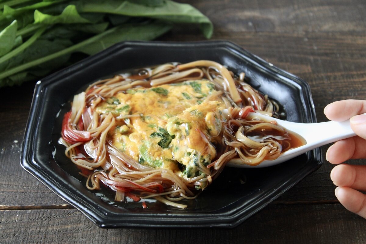 どんぶりにご飯を入れて、卵とあんかけをのせてもおいしくいただけます。ご飯と一緒に食べることで、ほうれん草の食感がより気にならなくなります。