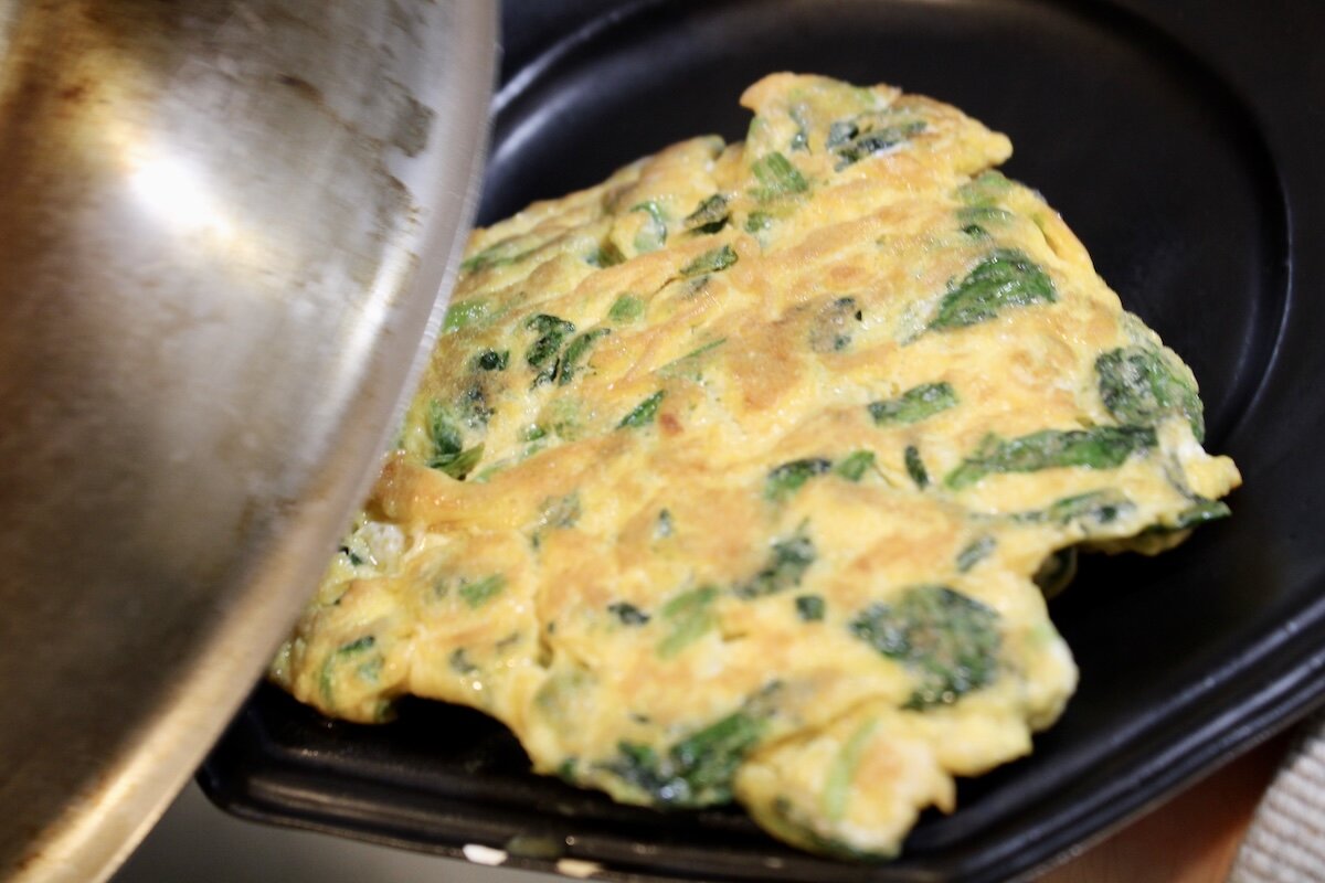 ボウルで卵を溶き、シュレッドチーズ、ゆでたほうれん草、薄力粉を加えて焼いたチーズチヂミ。苦みやえぐみ、繊維ともに気にならなくなります。