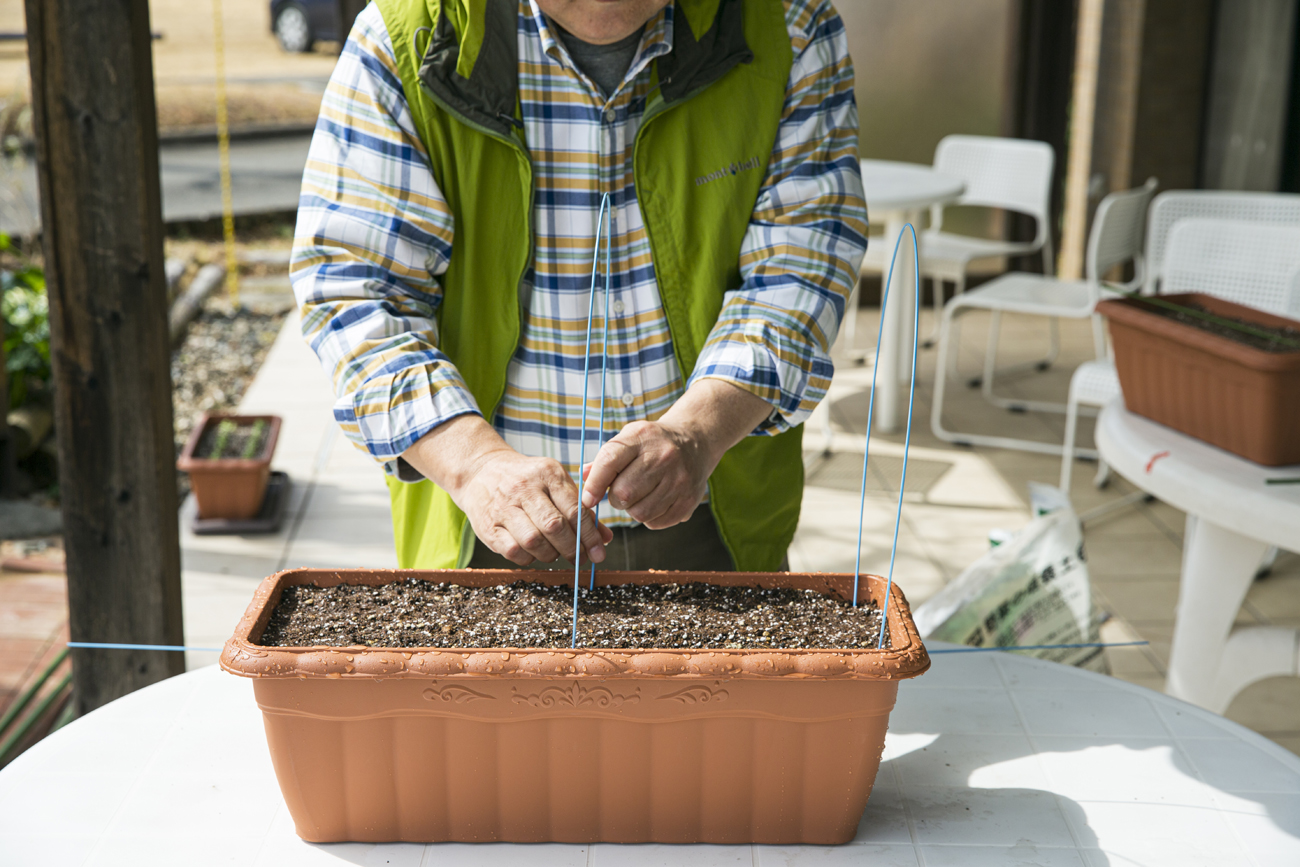 ①種まきを終えたプランターの隅に3本ワイヤーをさし込む。