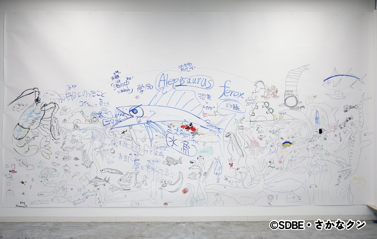 最後に「お絵描きをしましょう」という日比野先生の声かけで、壁一面の模造紙に海の生きものを描くことに! ダンゴウオやダイオウイカ、アオザメなど“推しのお魚”を描く子もいれば、空想の生きものを描く子も。さかなクンや日比野先生に見守られながら、子どもたちは自由にドローイングを楽しみました。