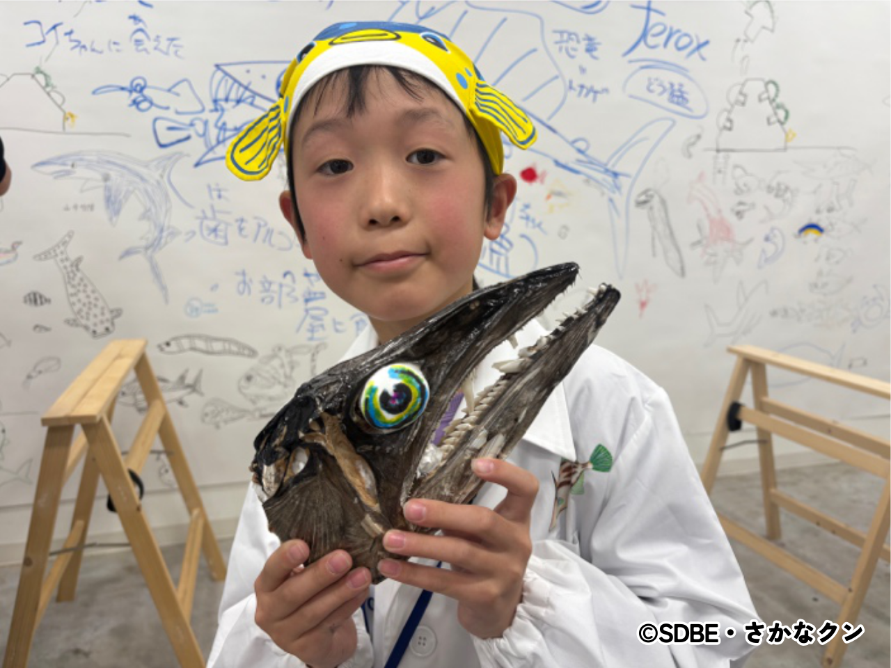 すると、解剖後にミズウオの“お頭”を持ち帰った隊員が、完成した剝製を持ってきてみんなに披露してくれました。「かっけえーーー!」と、大興奮のさかなクン。日比野先生も「すごいね!」と、そのクオリティの高さに驚いた様子。隊員はさかなクンの剝製の作り方を参考に、目玉を取り出した“お頭”をエタノールに2~3日漬け、紙粘土で作った目玉を入れ、ニスを塗って仕上げたそうです。