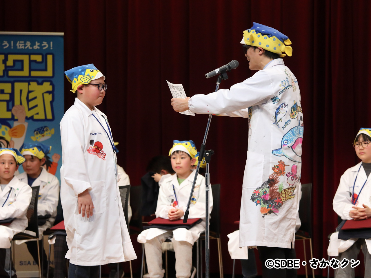 発表会の後は、修了式へ。さかなクン、清水先生、内田先生が登壇し、隊員たちにエールを送りました。