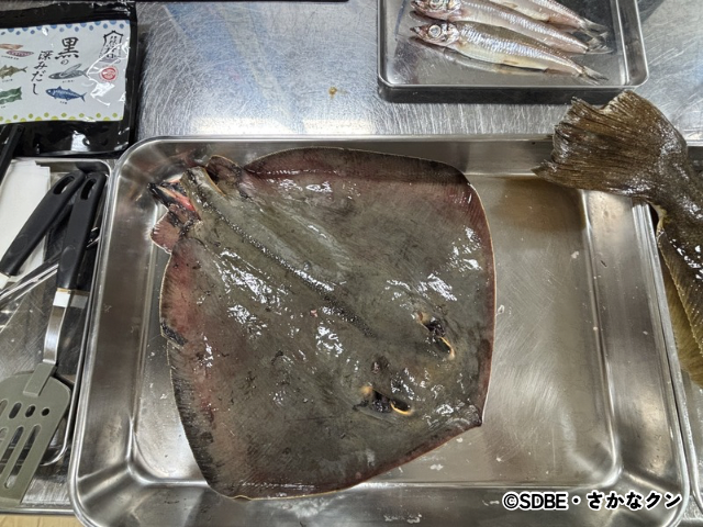 続いて、ニギス、アカエイ、ヒラメについてのお話がありました。ニギスは漁獲量が少なく鮮度が落ちやすいため、市場に出回りにくい低利用魚ですが、石川や愛知などの産地では、つみれや干物、揚げ物にして食べられているそうです。東京湾でも獲れるアカエイも、低利用魚のひとつ。バター焼きやフライ、煮付けにするとおいしくて、さかなクンはギョ飯が何杯あっても足りないのだとか。アカエイはアサリなどの貝類を食べるため、アカエイが増えすぎると、アサリが減ってしまうこともある、といいます。アカエイもおいしく食べることが、海の資源を守るためにも大切なのですね。