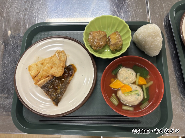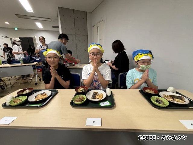 そして、先生が作ったアカエイの唐揚げとおにぎりを添え、低利用魚メニューの献立が完成! ランチタイムでは、子どもたちの笑顔があふれました。「低利用魚を初めて食べたけど、どれもおいしかった」「アカエイの軟骨が、コリコリしていて心地よかった」「こんなにおいしいのに、なんで市場に回らないんだろう」など、低利用魚の味わいに驚いたり感動したりしているようすでした。