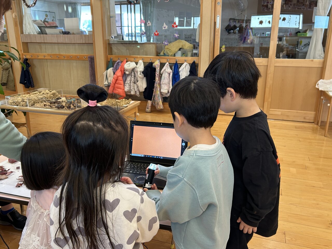 友だちがマイクロスコープで観察している隣で順番を待っていた子が、ただ見ているだけではなく「これは何だろうね?」と疑問を共有しながら自分も観察し、「こっちもやってみたら」と一緒にその子の探究に参加し始めました。