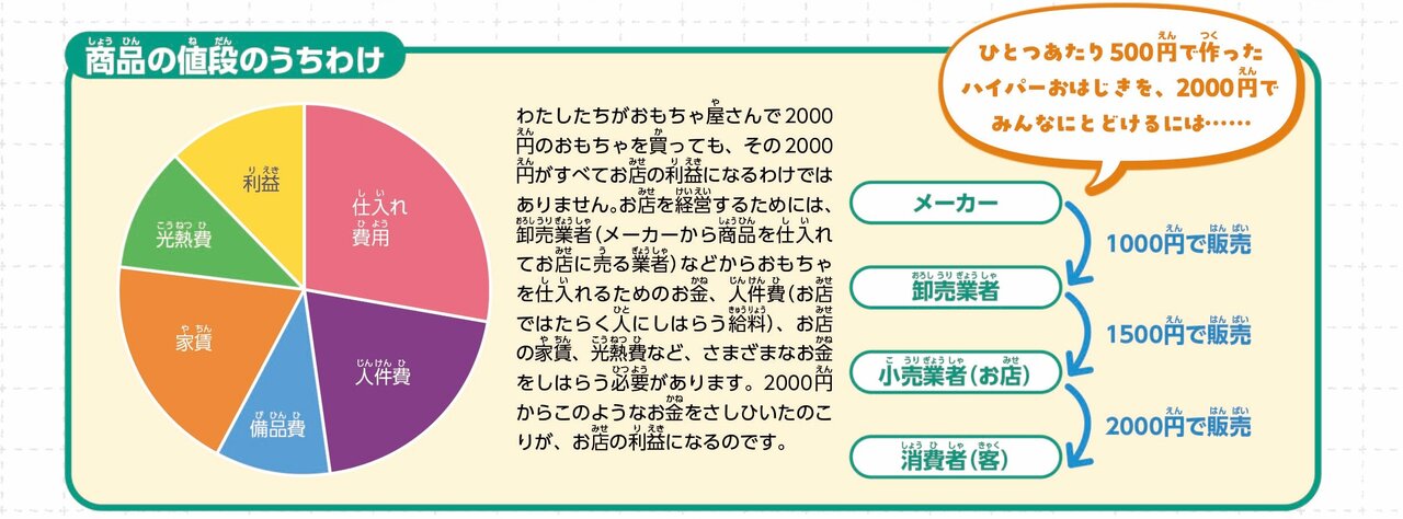 商品の価格設定は最終的にお店が決めますが、メーカーが卸業者や小売店に商品を売るときには「希望小売価格」をしらせます。お店はその金額を参考にして、仕入れ額に、お店で働く人に支払う給料などの「人件費」、お店をやるのにかかる「家賃」や「光熱費」、「備品費」、さらにお店の「もうけ(利益)」を足して、売値を決めます。