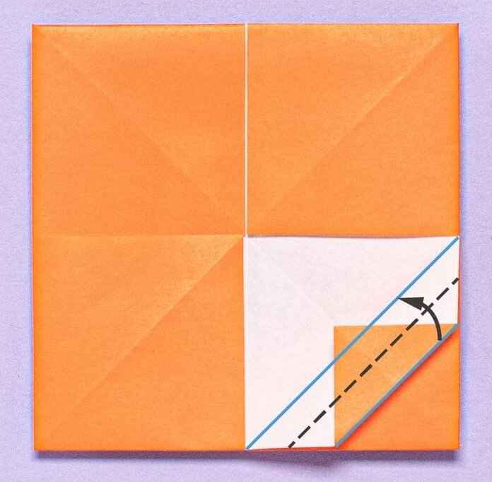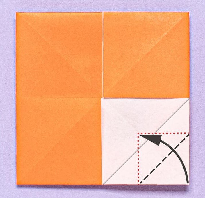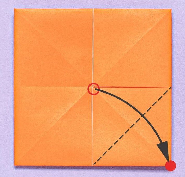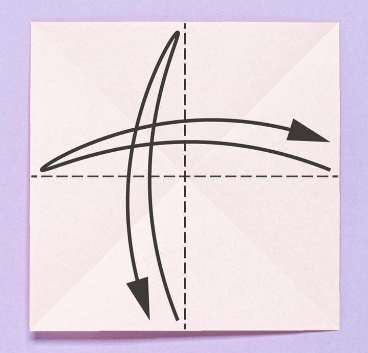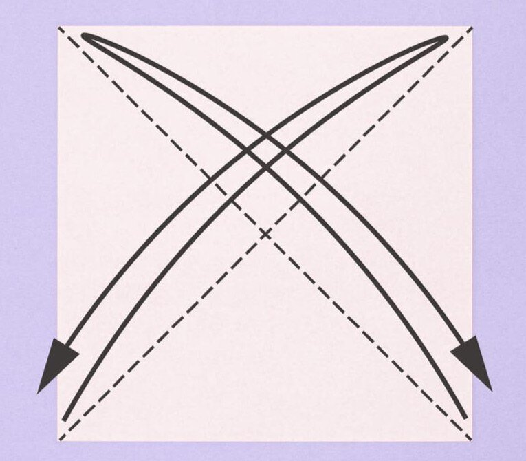 ①おりがみを1枚用意し、点線で対角線上に折りすじをつける。
