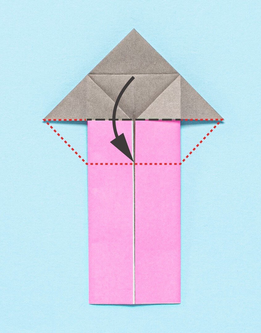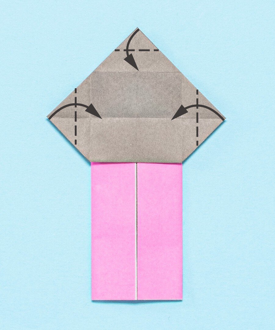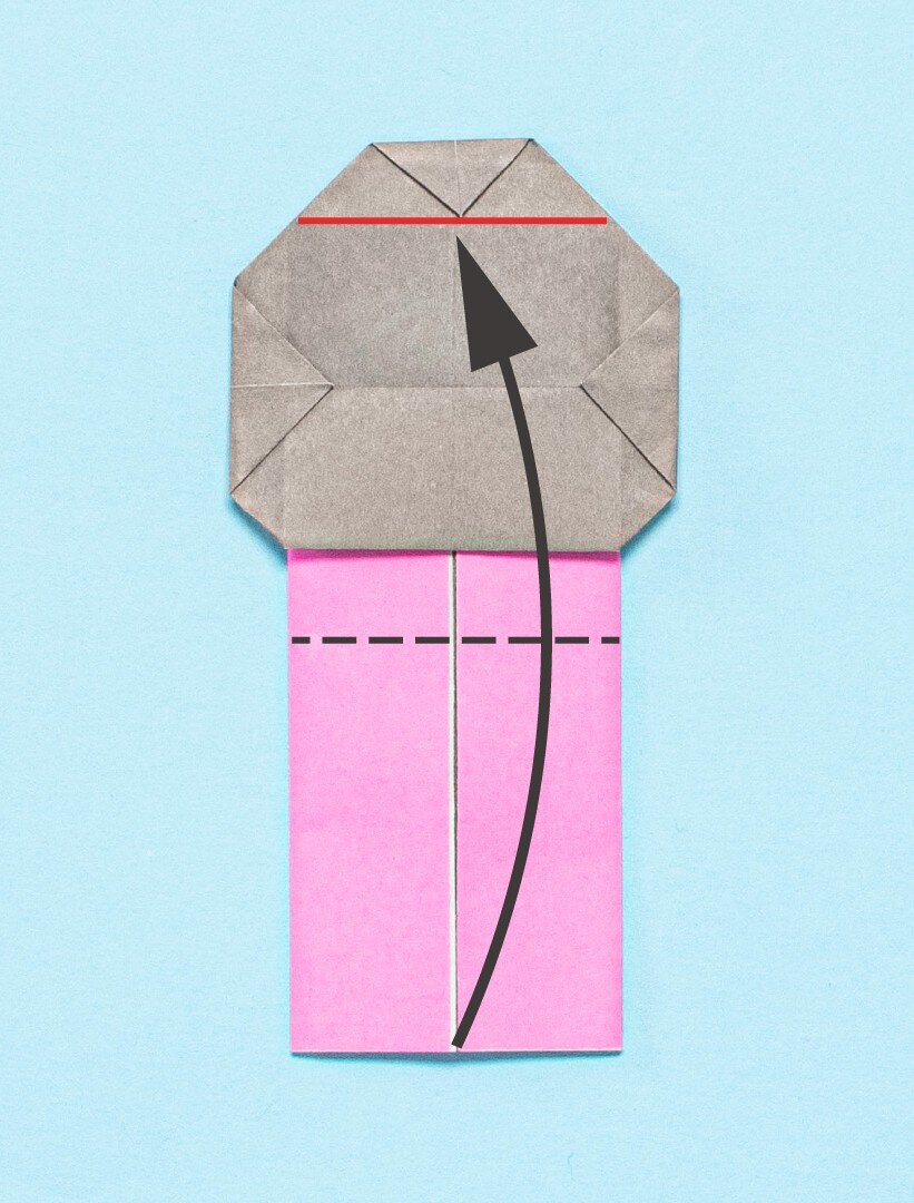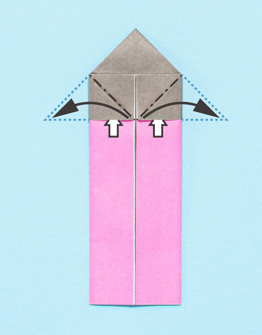 ①「おだいりさま」の⑨まで折り、⇒印から隙間を開いてつぶすように折る。