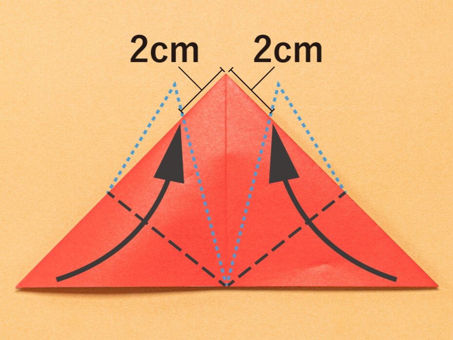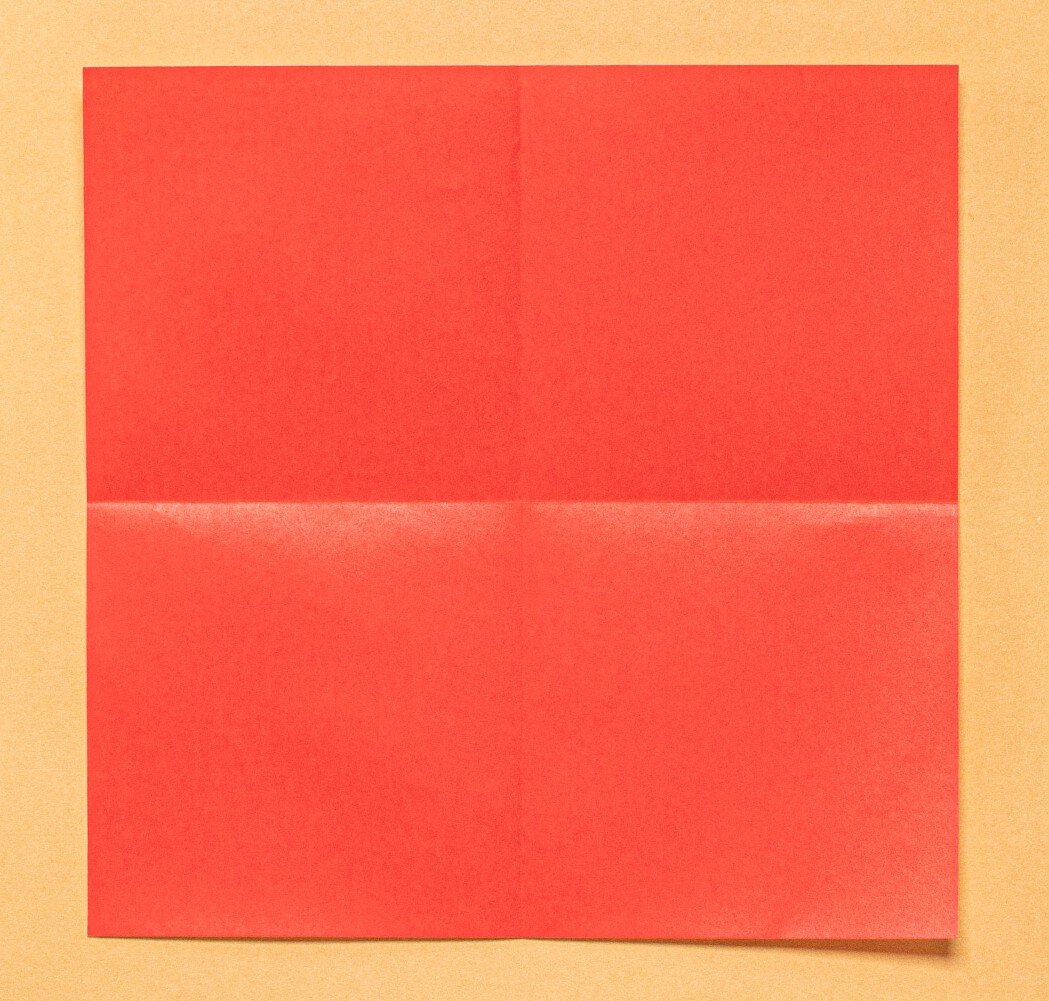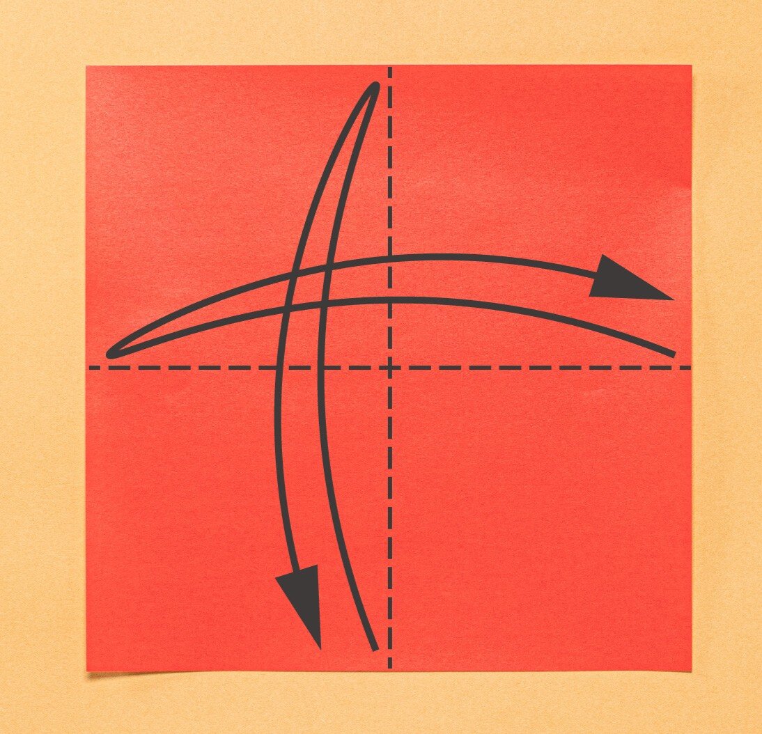 ①折り紙(15×15cm)を1枚用意し、点線部分に折りすじをつける。