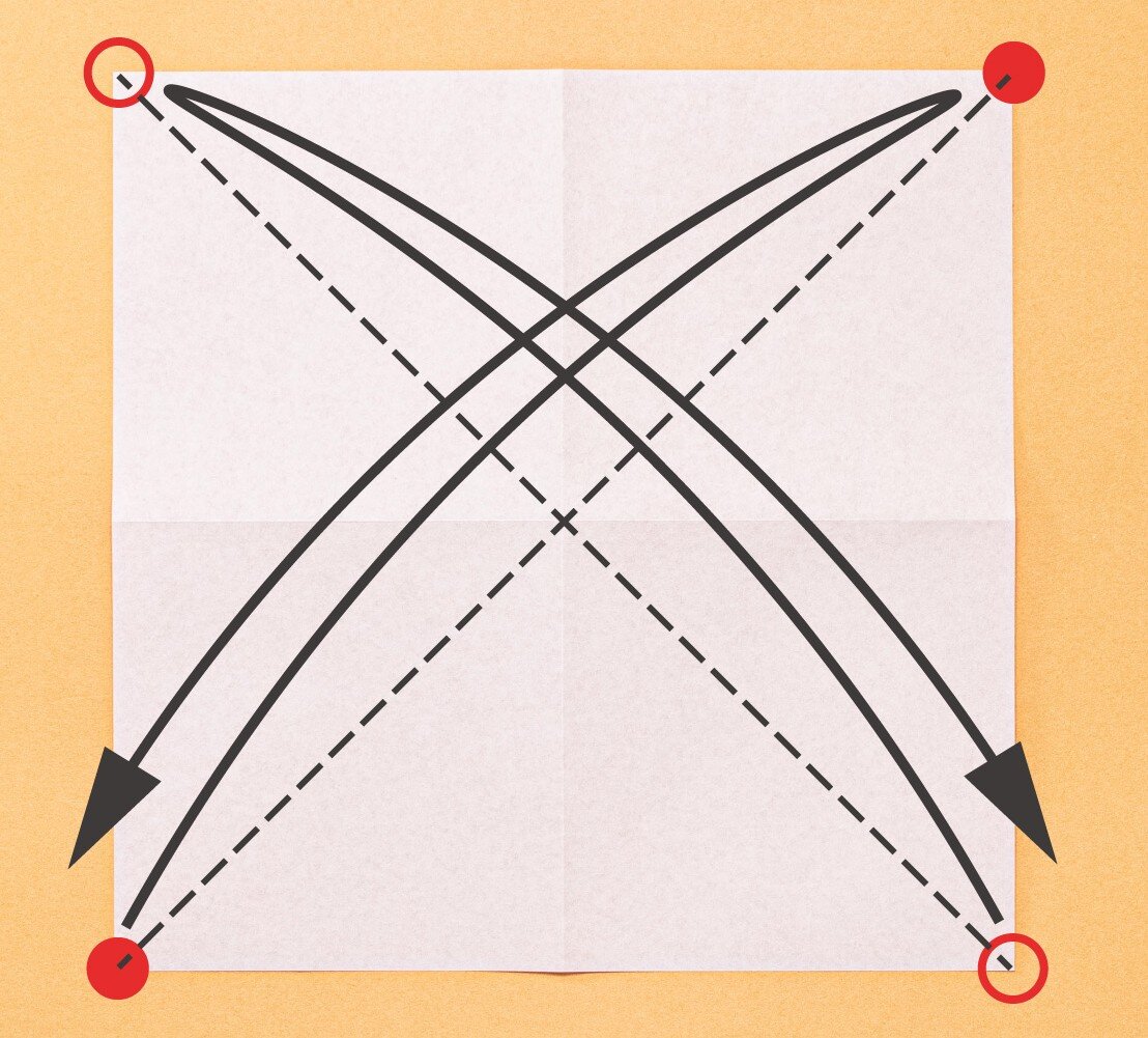 ②裏返して、○と○、●と●を合わせて点線部分に折りすじをつける。