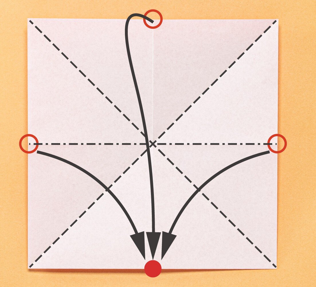 ③折りすじを使って、3ヵ所すべての○を●に重ねてたたみ、三角形になるように折る。