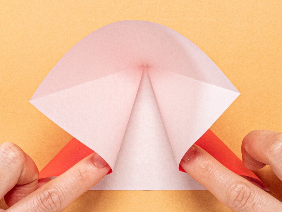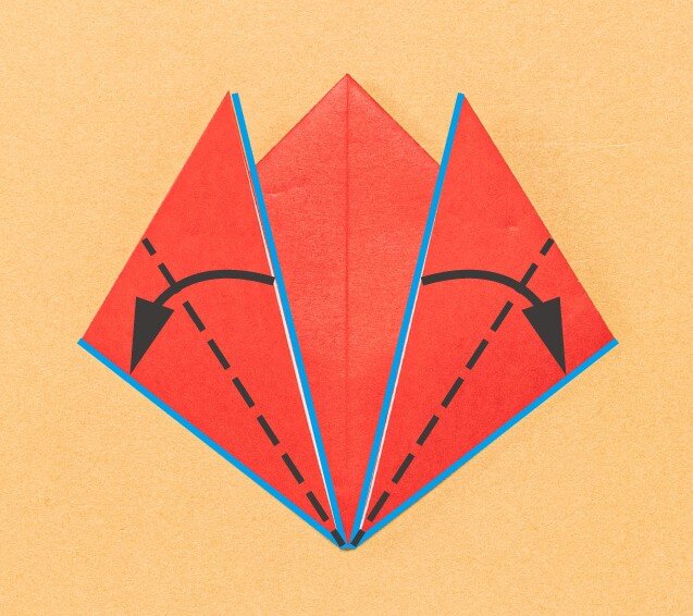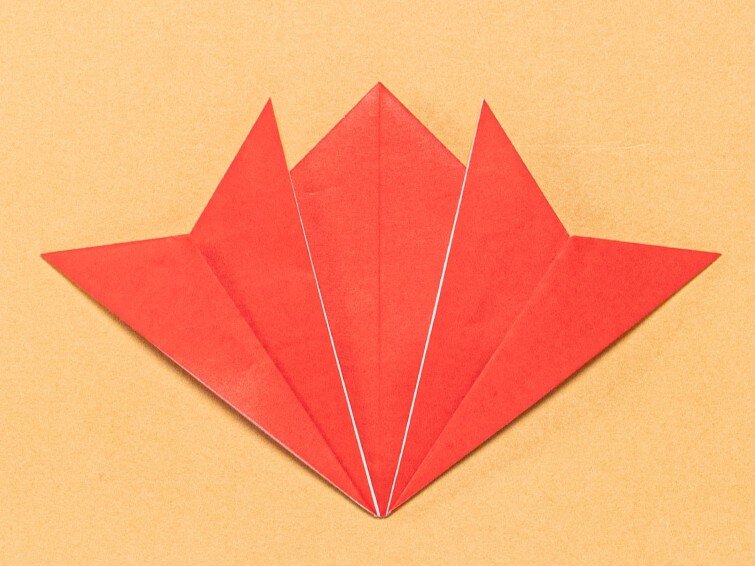 ⑤手前の紙だけ、青線同士を重ねるように折る。カーネーションのお花部分が完成。