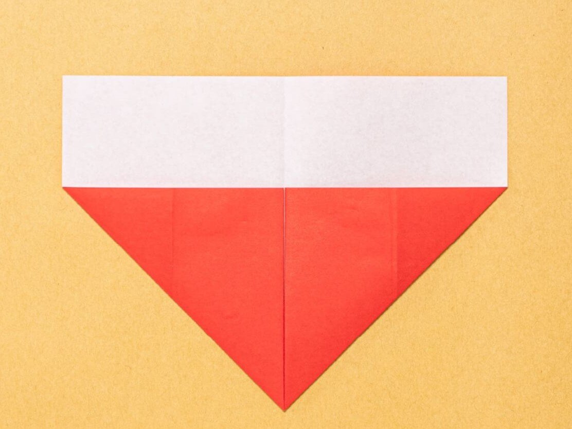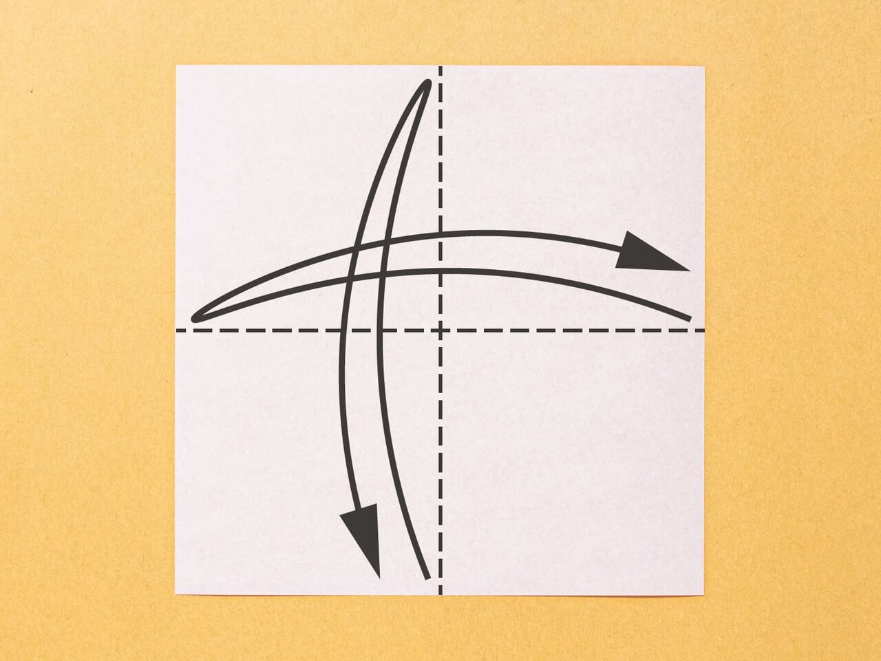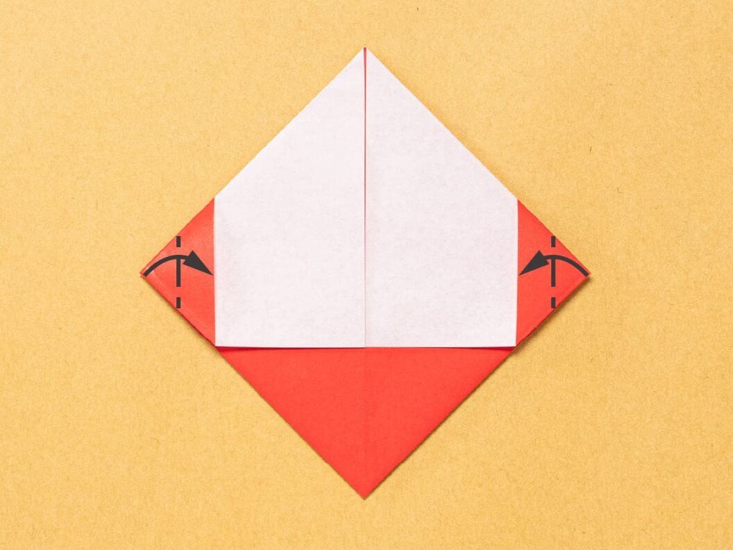 ①赤色の折り紙(15×15cm)1枚を用意し、点線の部分に折りすじをつける。