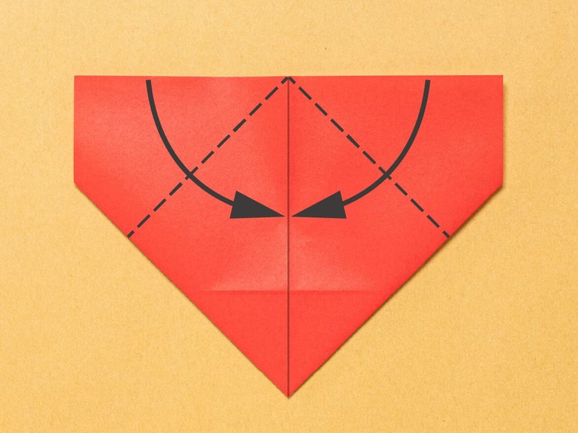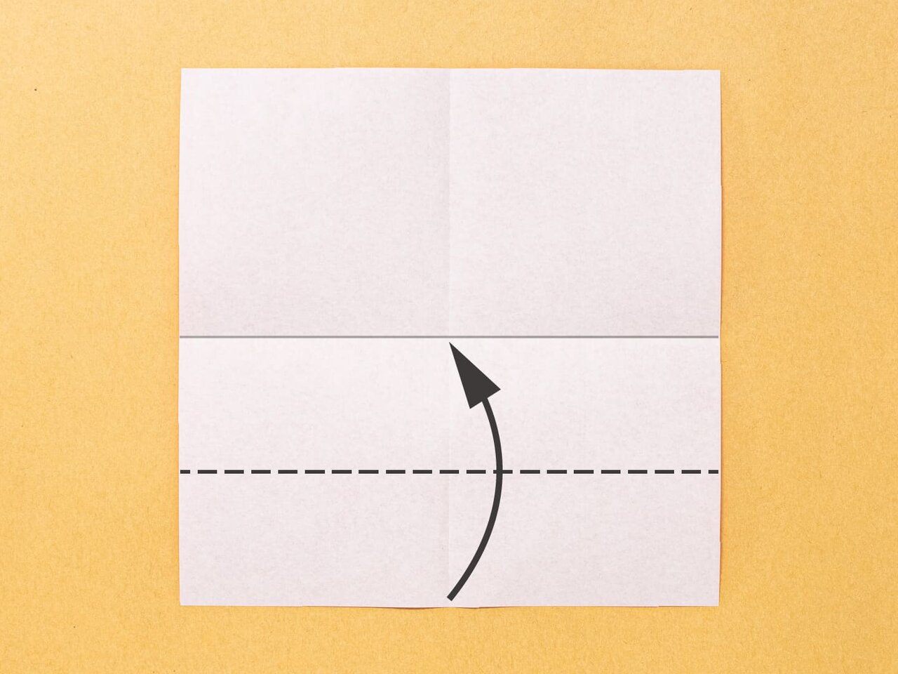②下の端を、中央の折りすじに合わせて点線部分を折る。