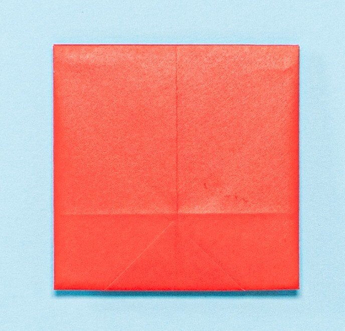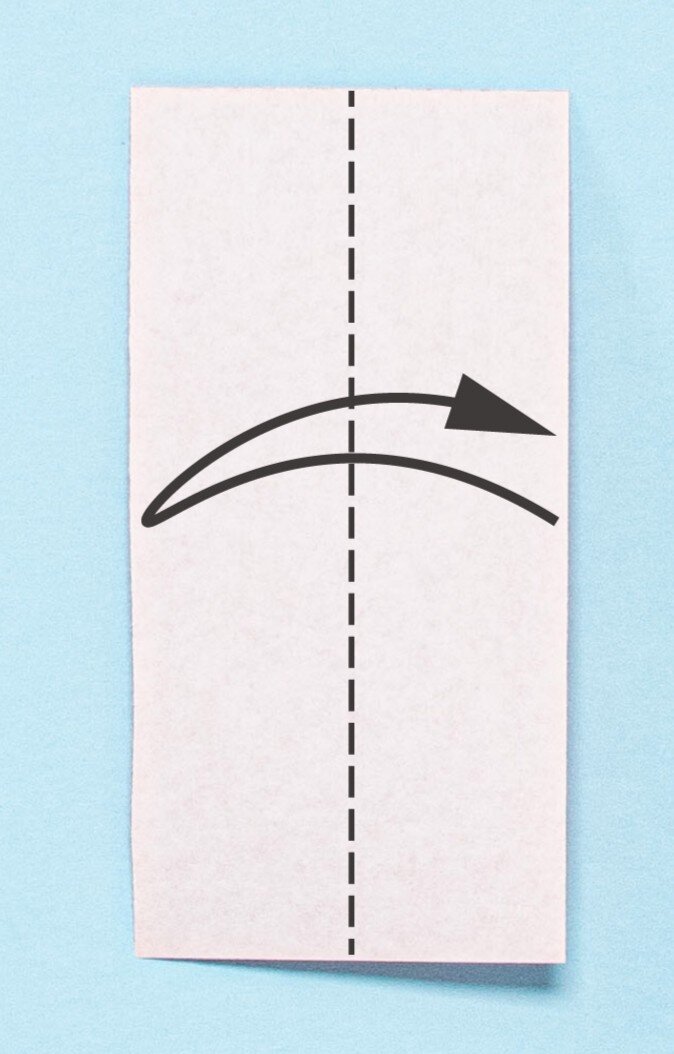 ①折り紙(7.5×3.75cm)を2枚用意し、まず1枚の左右の端を合わせて、折りすじをつける。