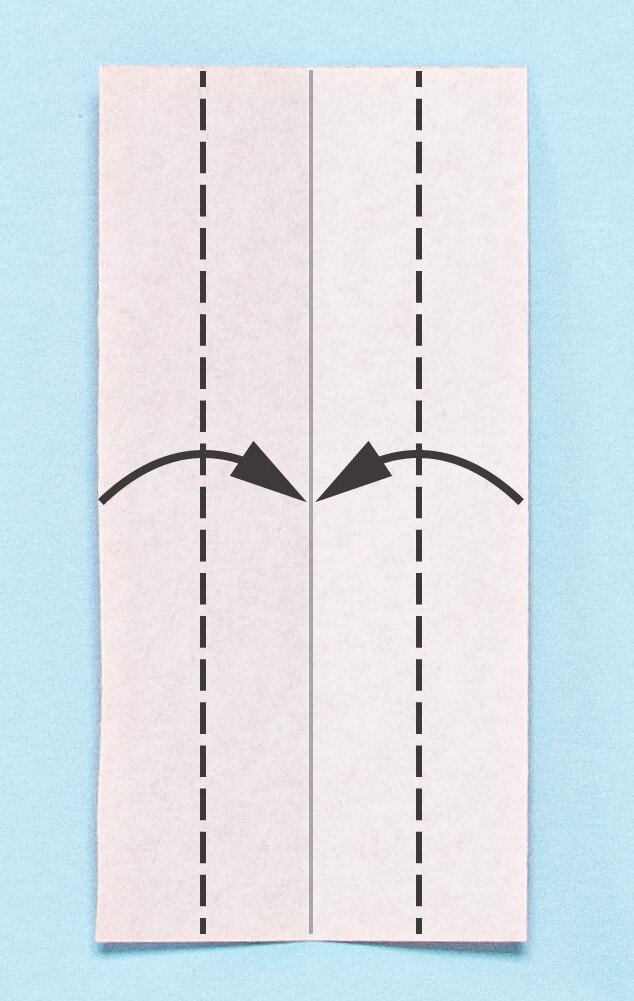 ②左右の端を中央の折りすじに合わせて点線部分で折る。