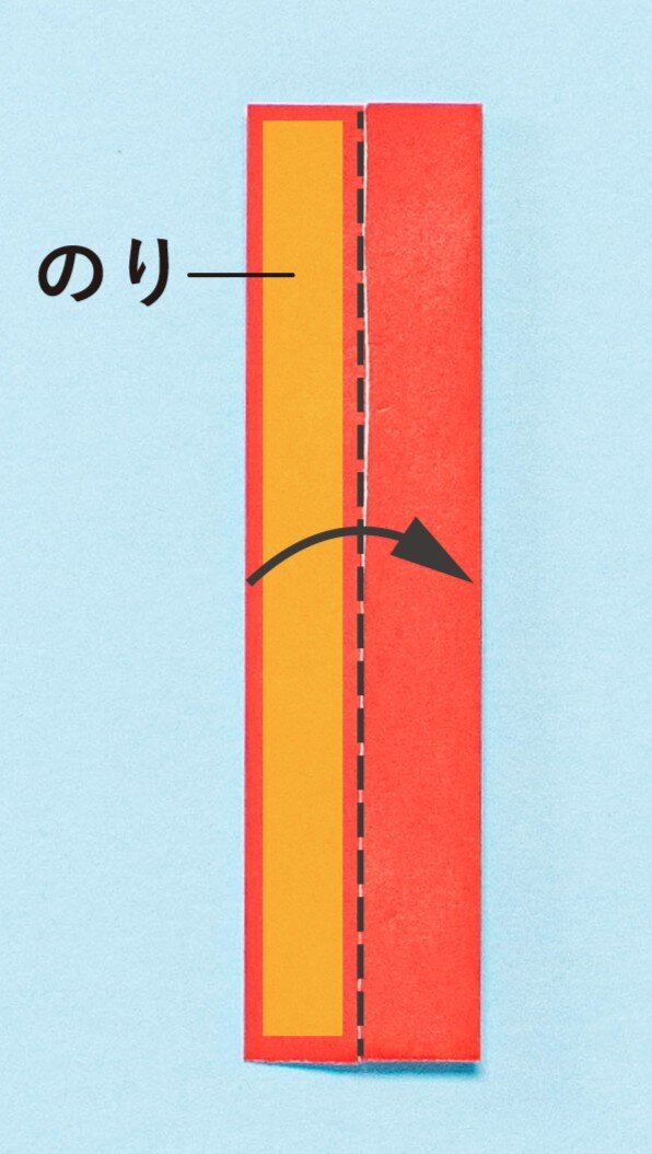 ③中央の折りすじで点線部分で半分に折り、のり付けする。