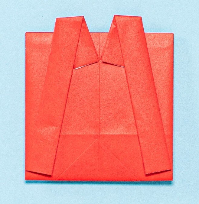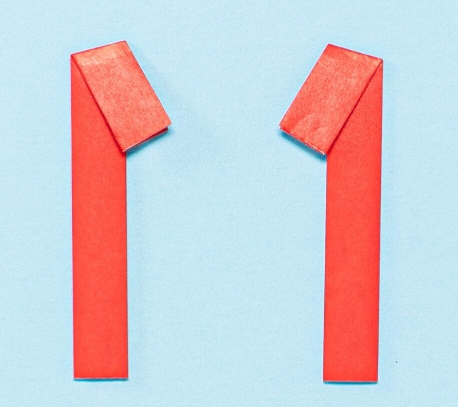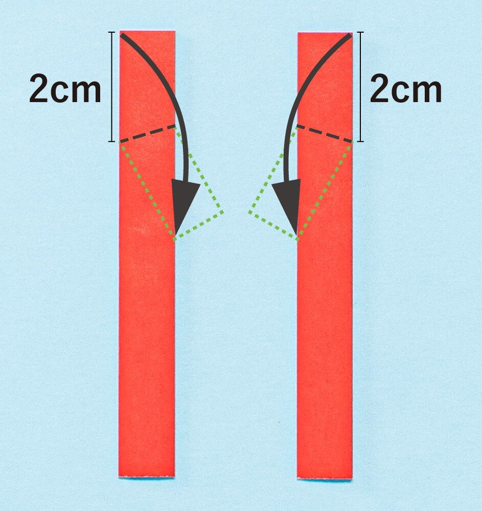 ④もう1枚の紙で①~③の工程を繰り返して同じものをもう1つ作り、それぞれ上から2cmのところで内側に斜めに折る。これでランドセルのベルトが完成!