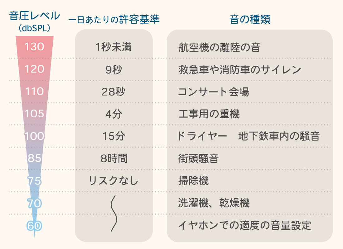 さらに100dB(ドライヤー、地下鉄車内の騒音)になると、短時間でも急に聴こえづらくなることがあります。