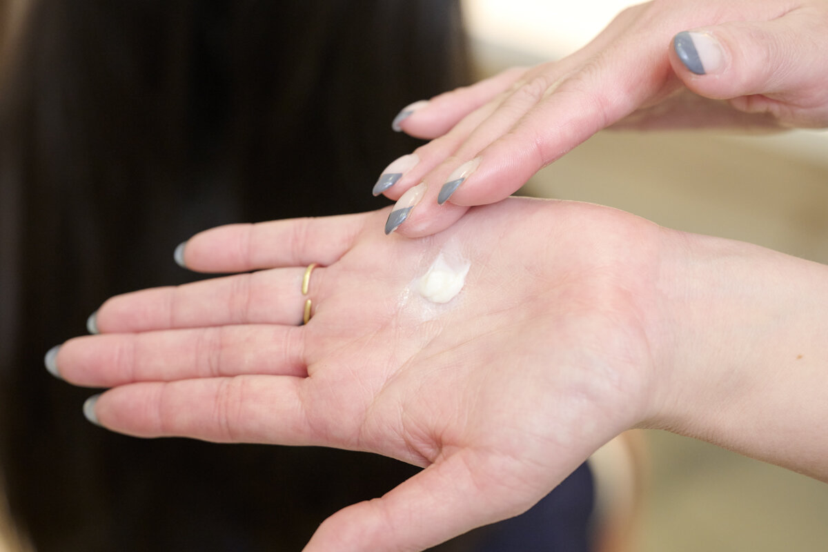 髪が整ったら、パール1粒分くらいのヘアワックスをとり、手のひらでなじませてハーフアップする部分の毛につけます。