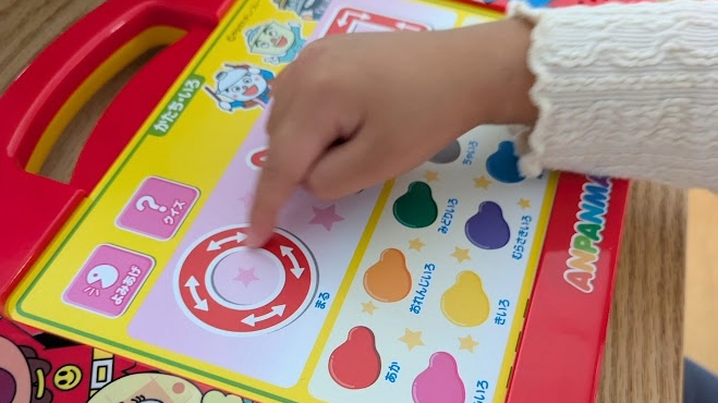 アンパンマンタブレットの操作感は、まるで本物のタブレットのよう! 指で画面を軽くタップしたり、なぞったりするだけで反応します。3歳の小さな指でもしっかり反応するので、娘もとても楽しそうでした。