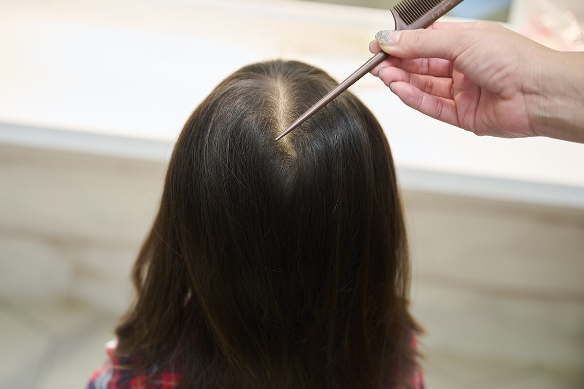 つむじのあたりから、ジグザグに分け目をつけていきます。