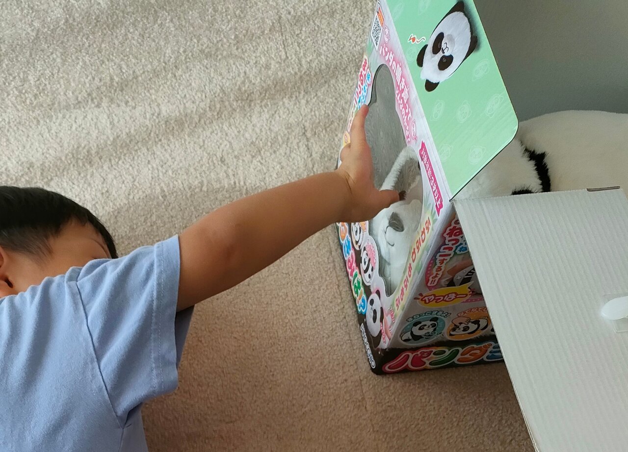 届いた箱の透明な窓から見えるパンダに3歳の息子は大興奮。