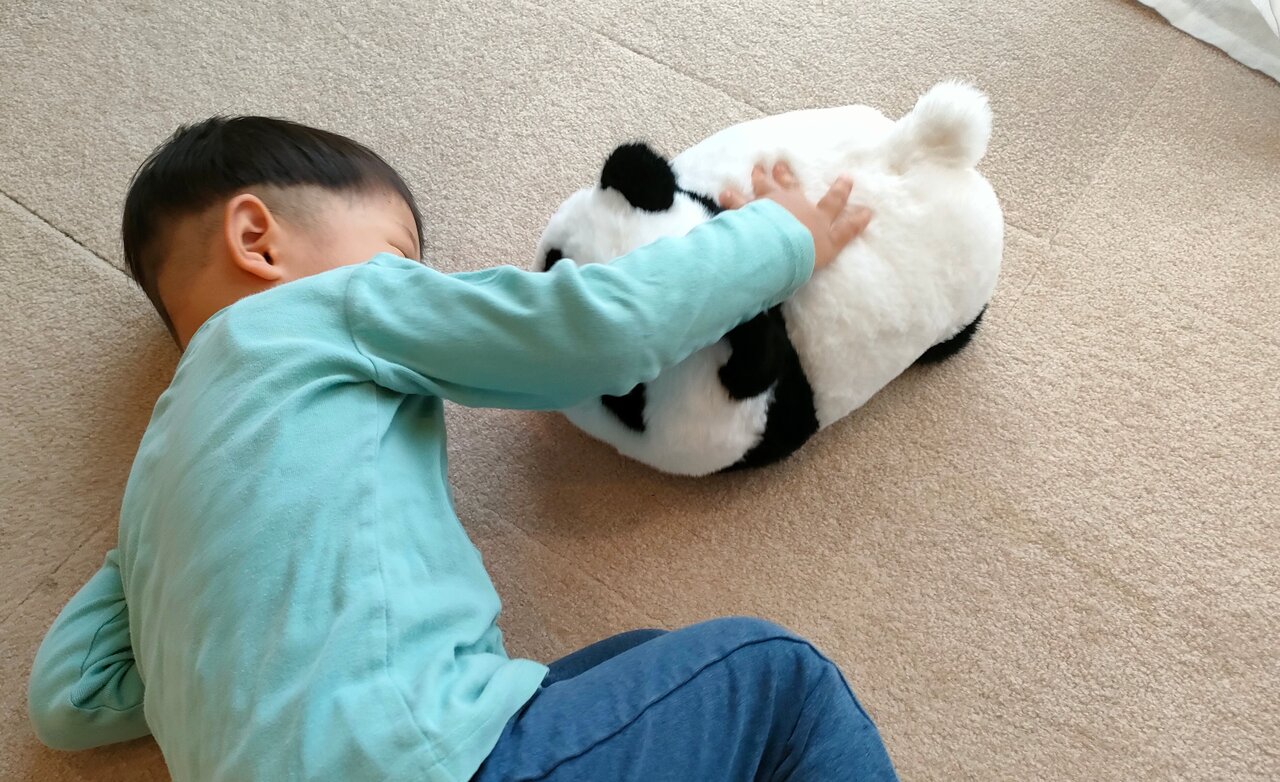 「パンダちゃん、おめめとじてるよ。ねんねだね~」と、息子はパンダをそっと抱えて寝室へ。布団の横に並べて、一緒にねんねしていました。