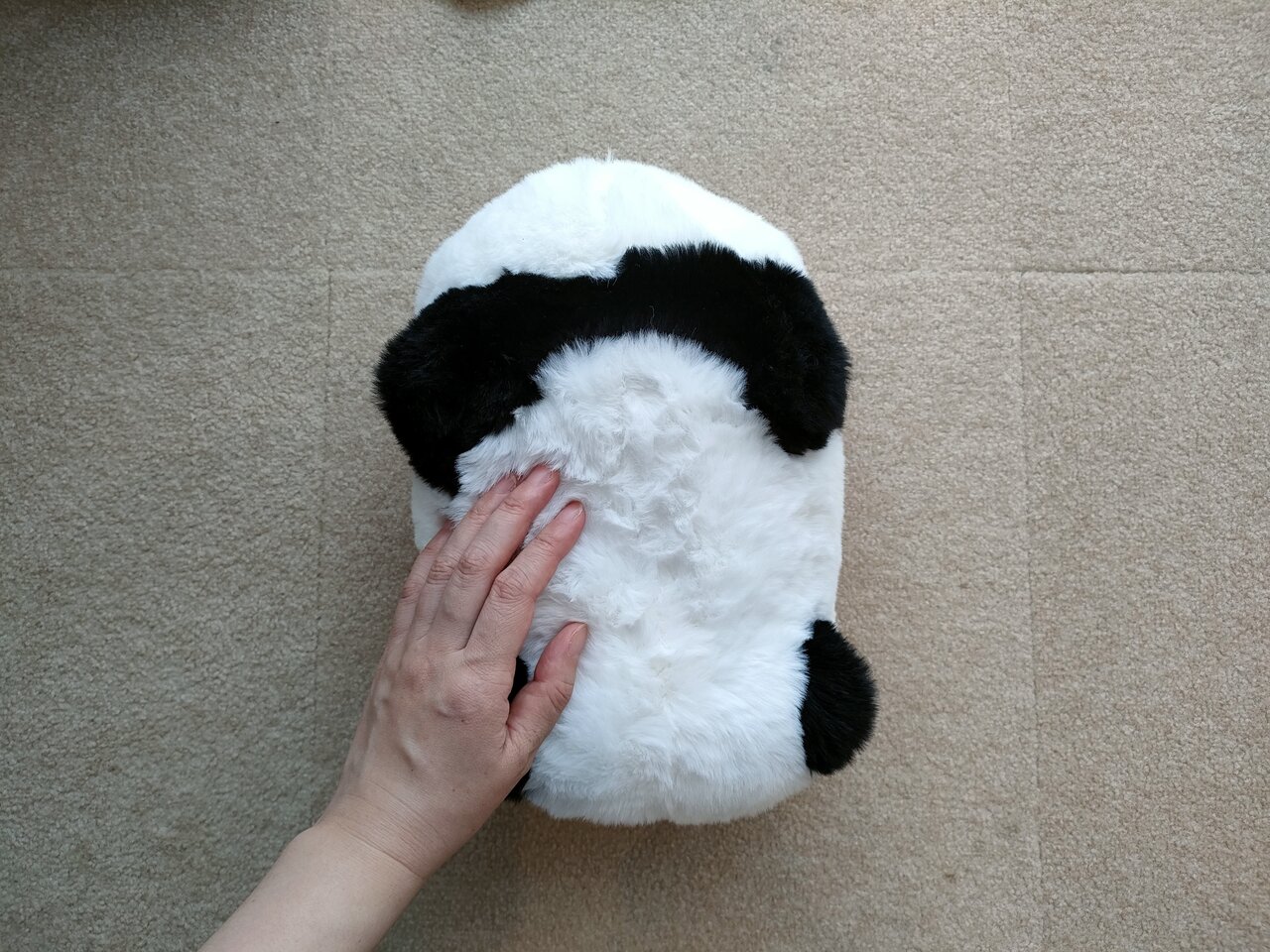 ちなみにおなか側にスイッチと電池が格納されており、面ファスナーでとめられています。電池を入れようとおなかを見たのですが、パッと見ただけでは面ファスナーがどこにあるかわからないほどのふわふわ具合でした。