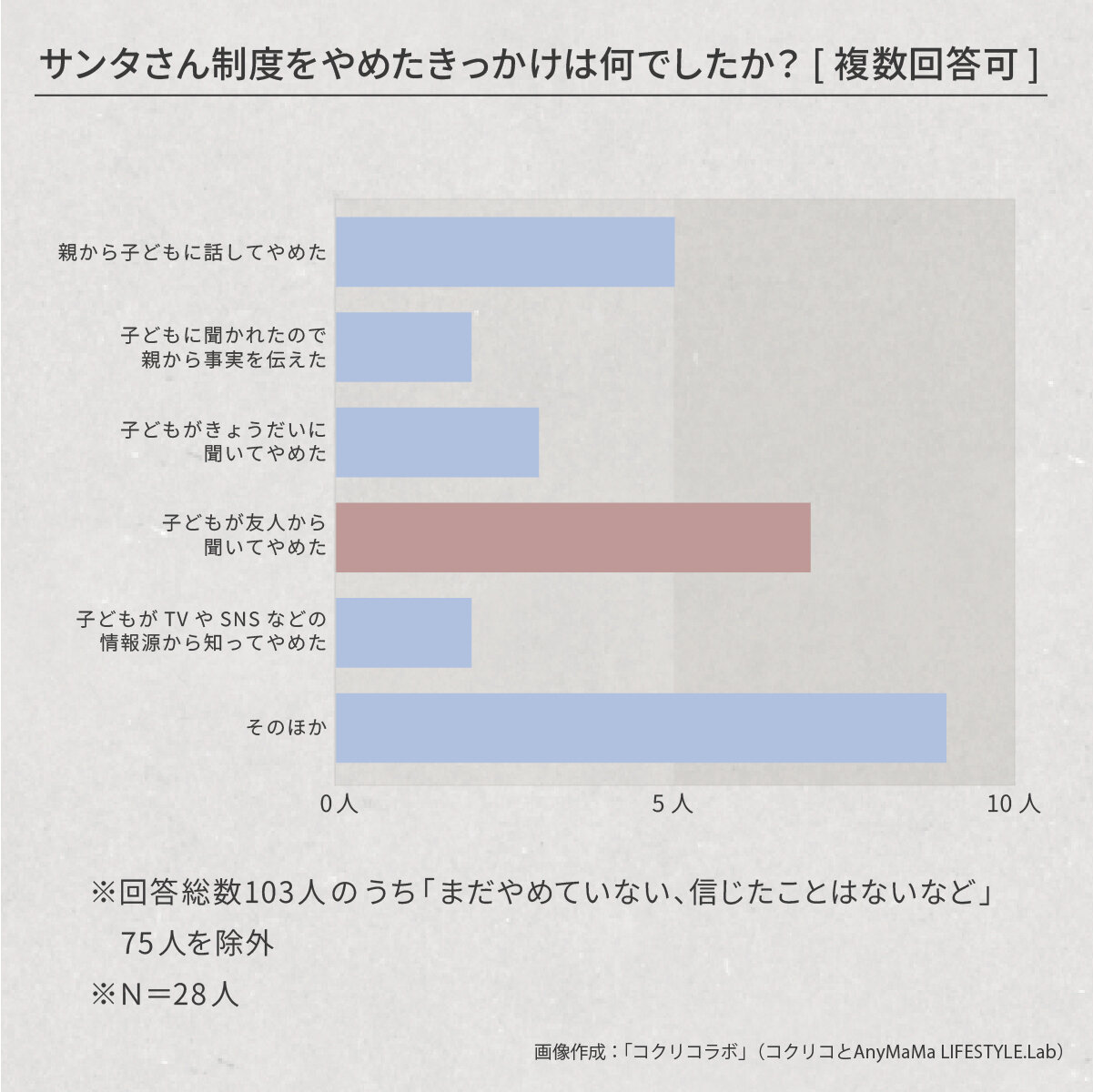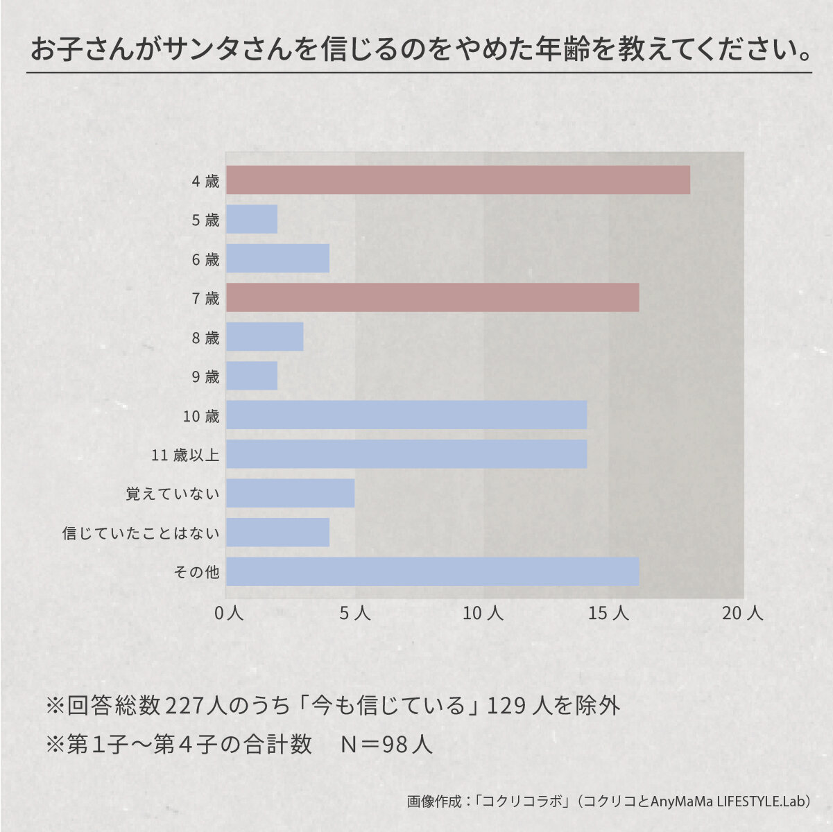 上のグラフから除外した「まだやめたことはない、信じたことはないなど」という回答の理由としては、子どもがまだ小さくてサンタさんを理解していない、宗教上の理由、親御さんの教育方針などが考えられます。
