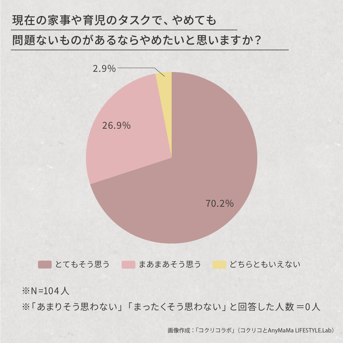 さらに「やめ家事」をしたいかどうかという質問には、なんと9割以上が「そう思う」(とてもそう思う、まあまあそう思う)と回答。「今のままでは回らない」「なんとかして時間を作りたい」という、ママたちの切実な叫びが聞こえてきそうです。
