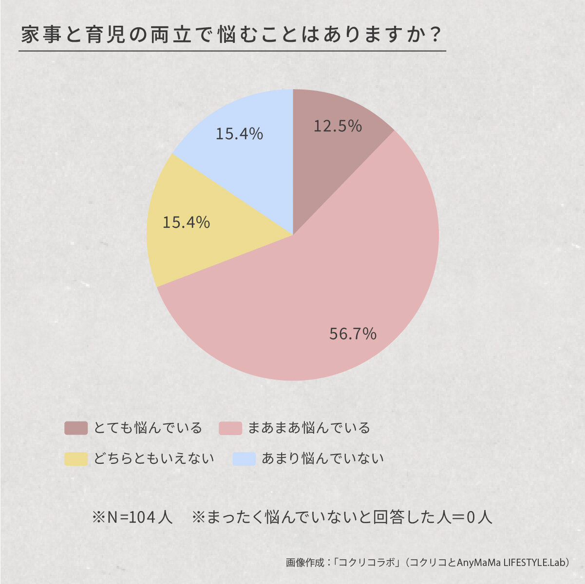 子育て中のママに家事と育児の両立で悩むことがあるかを聞きました。その結果「とても悩んでいる」「まあまあ悩んでいる」人たちが約7割もいることがわかりました。