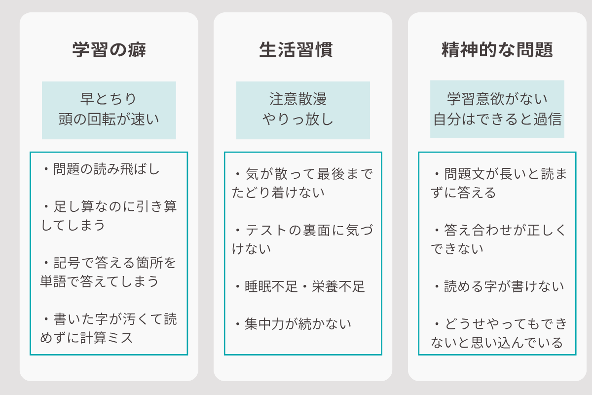 「1つめは学習の癖。問題の読み飛ばしや引き算すべきところを足し算してしまう、記号で答えるところを単語で答えるなど、早合点はミスに影響します。落ち着いてよく考えれば正解できるのに、先を急ぎすぎてミスを起こします。
