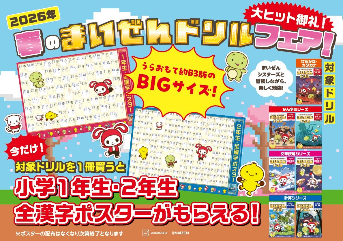 新刊発売記念として、2026年3月中旬より、対象ドリル全7冊の中から1冊ご購入ごとに、「特大全漢字ポスター」を1枚プレゼントするキャンペーンを実施します。