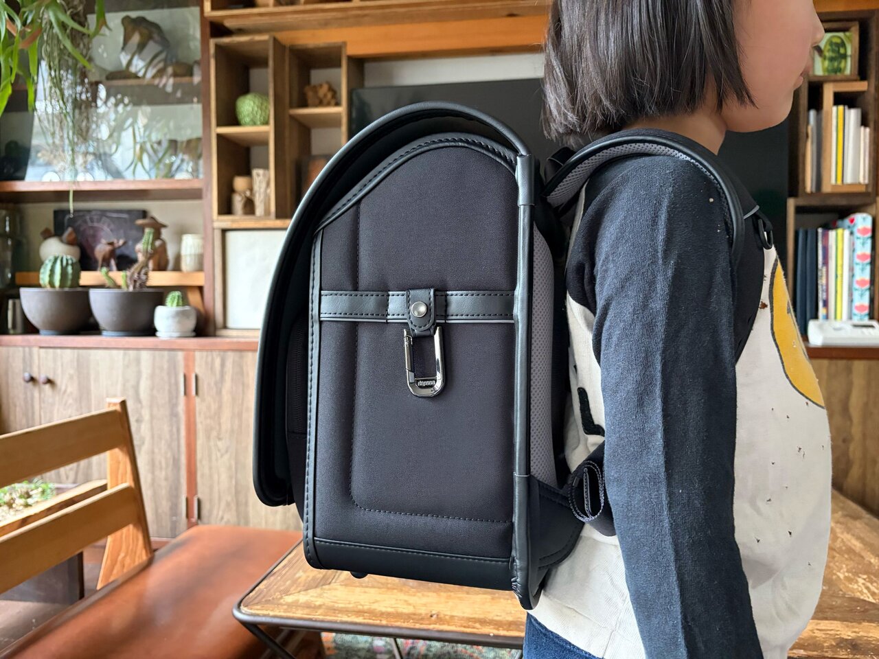 教科書などの荷物を半分ほど入れてみてもグラグラとせず、しっかり安定して背負えている印象。横から見ると、メッシュでふんわりした背面クッションと、無段階調節の肩ベルトが身体に優しくフィットしているのがわかります。荷物を入れたまま歩いたり走ったりしてもらいましたが、「重い?」と聞いても「大丈夫!」とのこと。