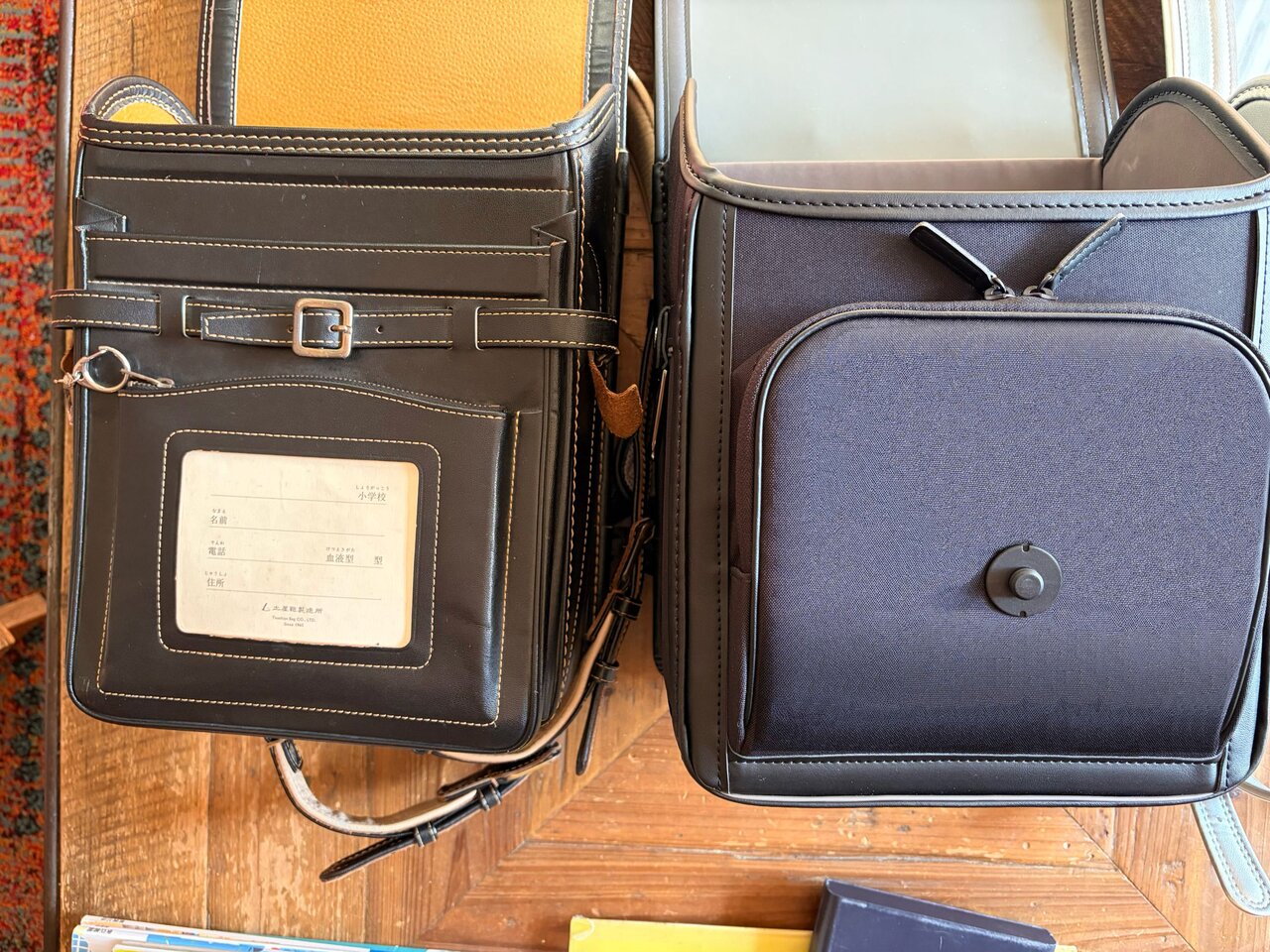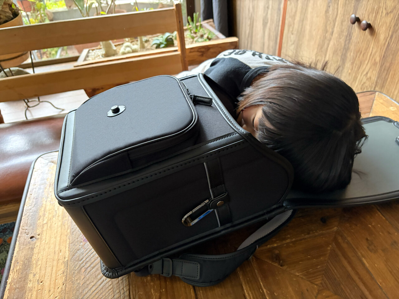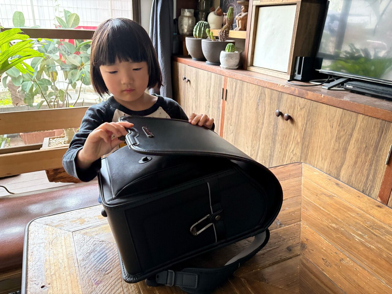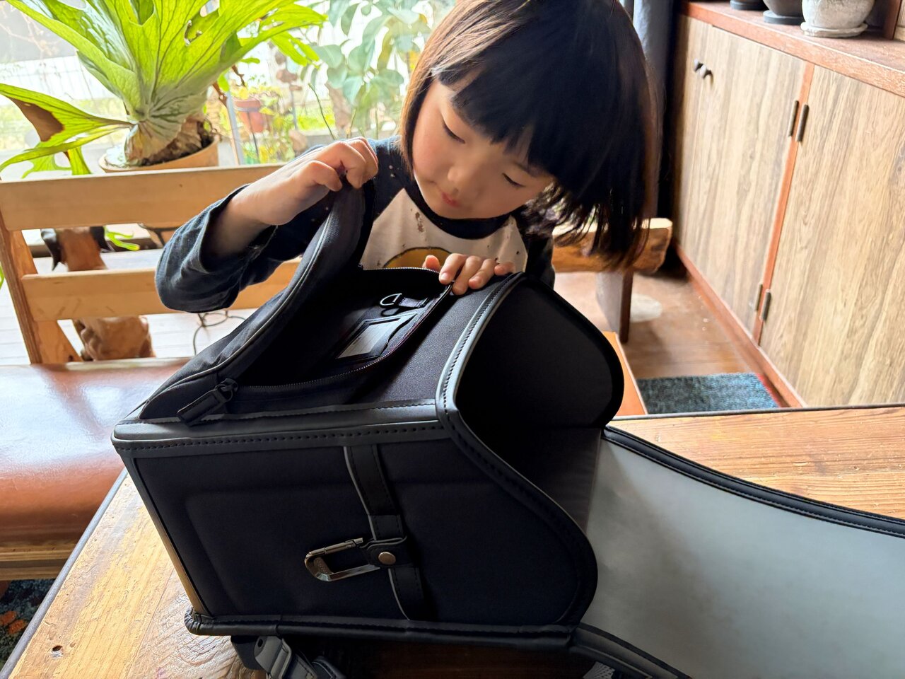 まず、初めて見た感想は3兄弟とも好感触。ポリエステル素材を使った軽量モデル「アクトライト」は、オールブラック仕様。「無駄なラインとかロゴがなくてシンプルだね。大人が仕事に持っていくカバンみたいでかっこいい」と長男。