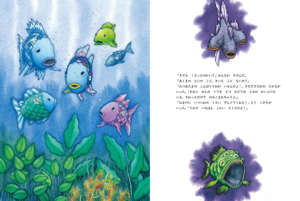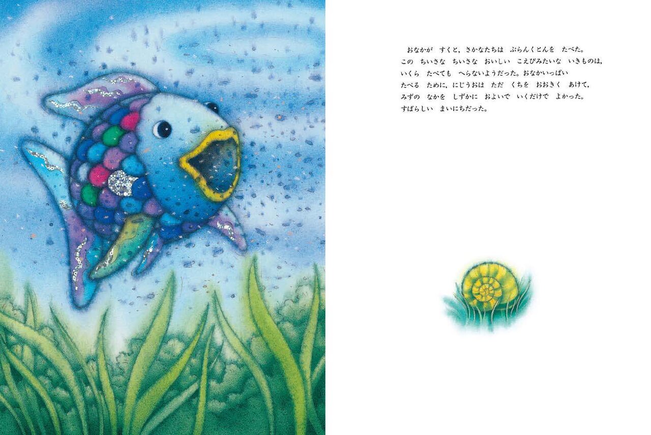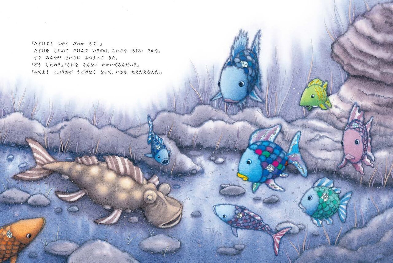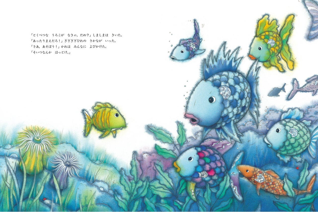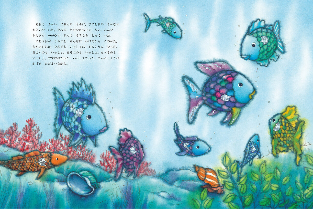 「これは2作目。物語のはじまりで、(1作目に続いて)にじうおと仲間たちがちゃんと1枚ずつキラキラしたうろこを分け合って仲良く泳いでいる絵が嬉しかったです。しましまと呼ばれている魚だけキラキラのうろこを持っていないんですが、種類が違っても仲良くできる、ということを確認できるお話」by藤本さん