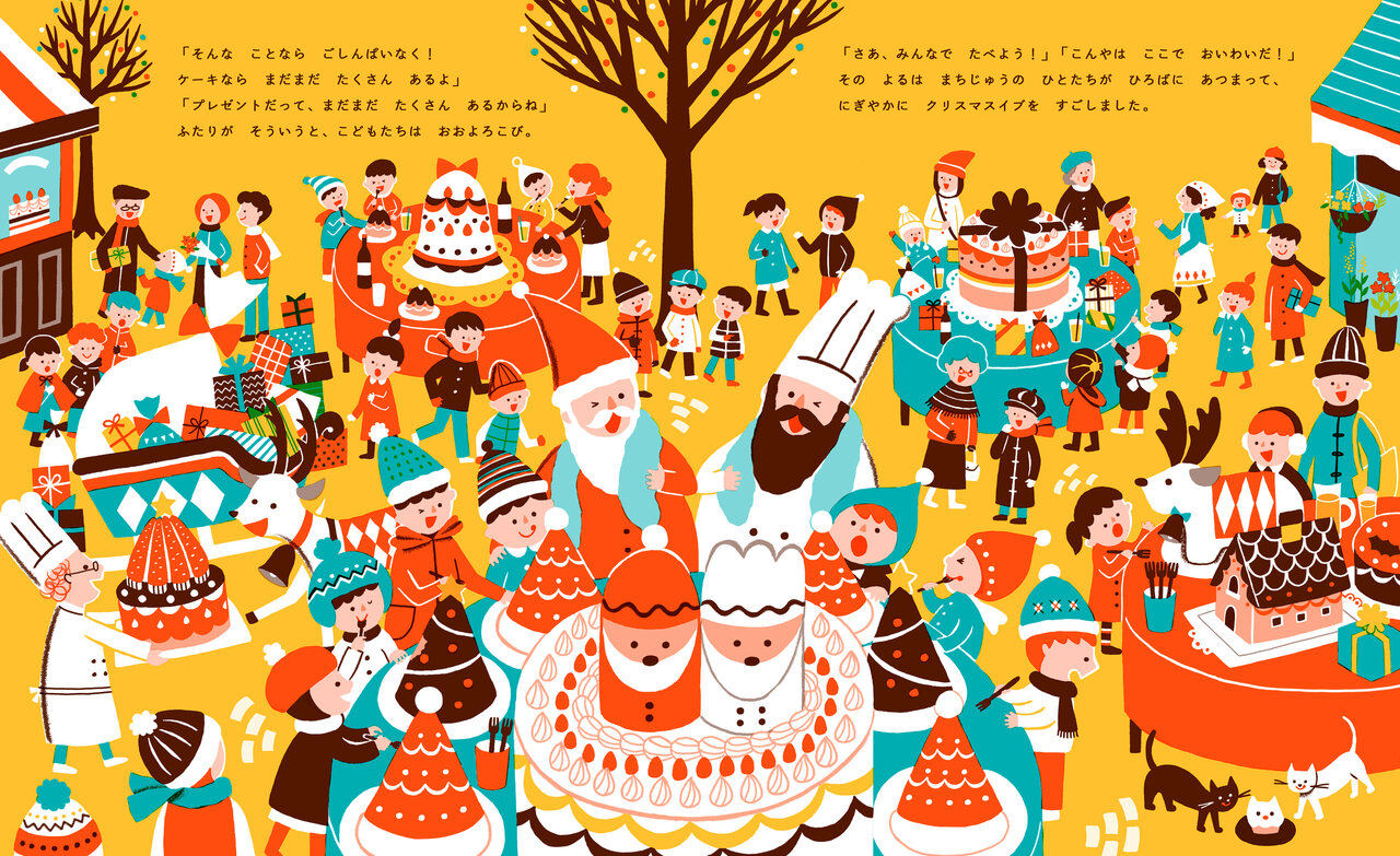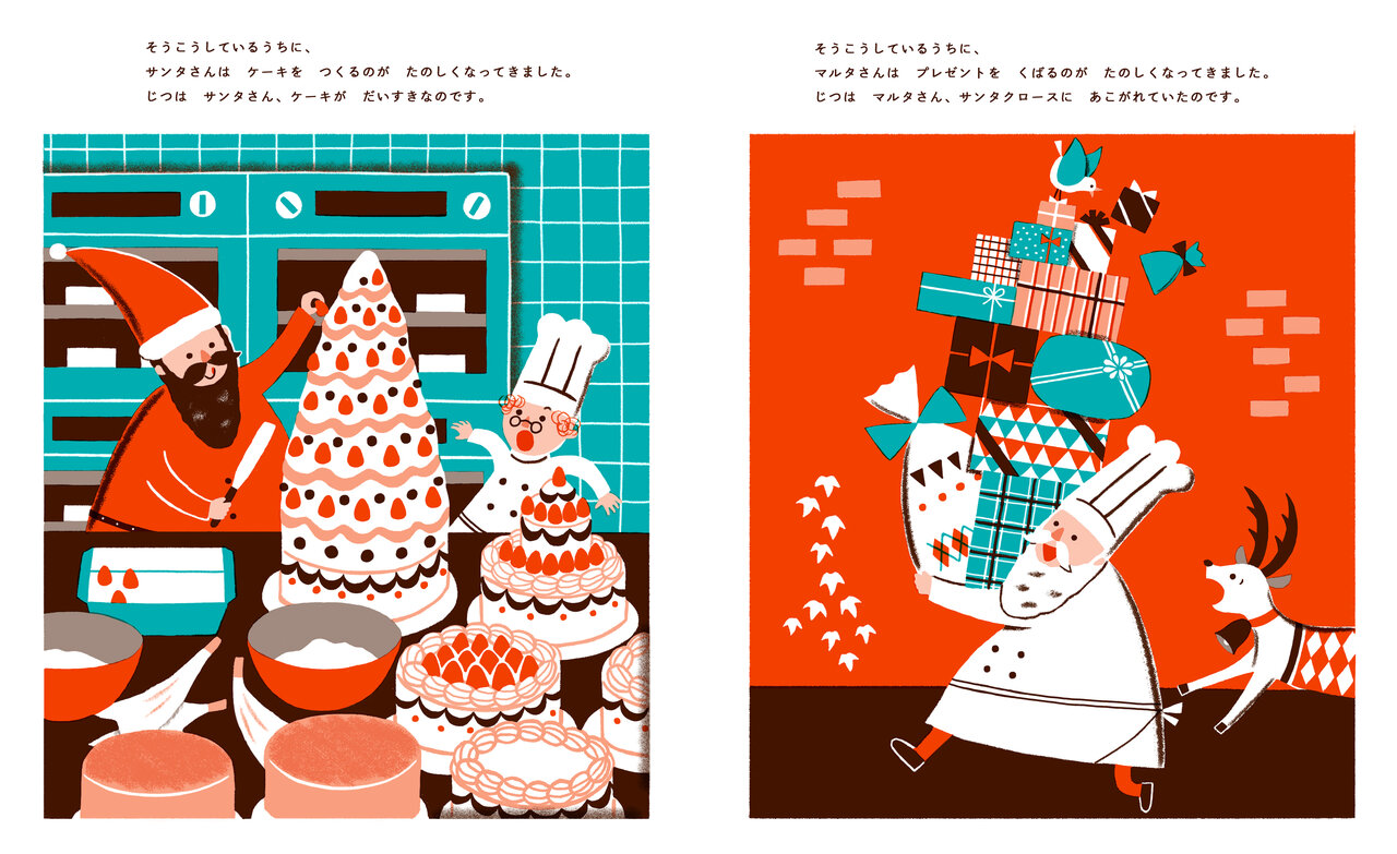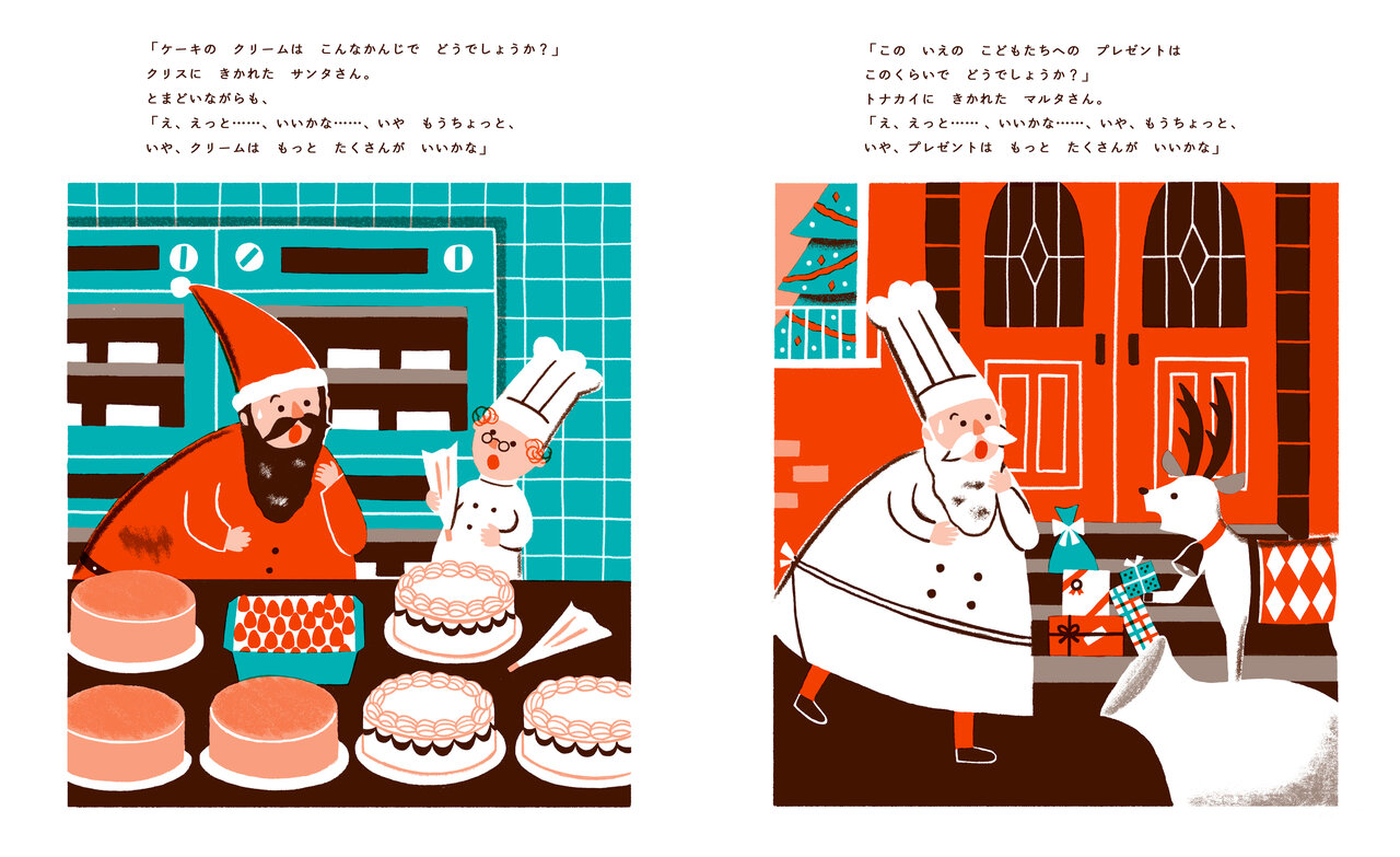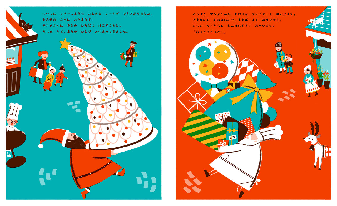 サンタさんはマルタさんにまちがえられ、マルタさんはサンタさんにまちがえられ……。クリスマスの前日に起こった、楽しいひと騒動。だからこの街には、サンタさんがふたり、ケーキ屋さんがふたりいるのです!