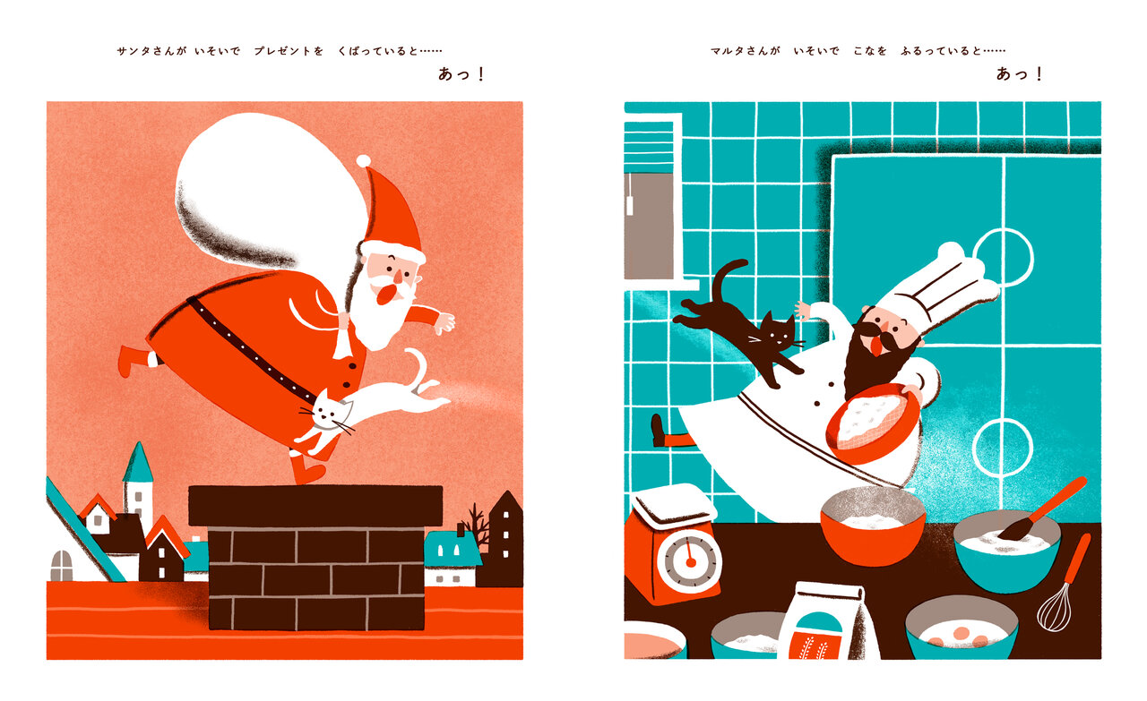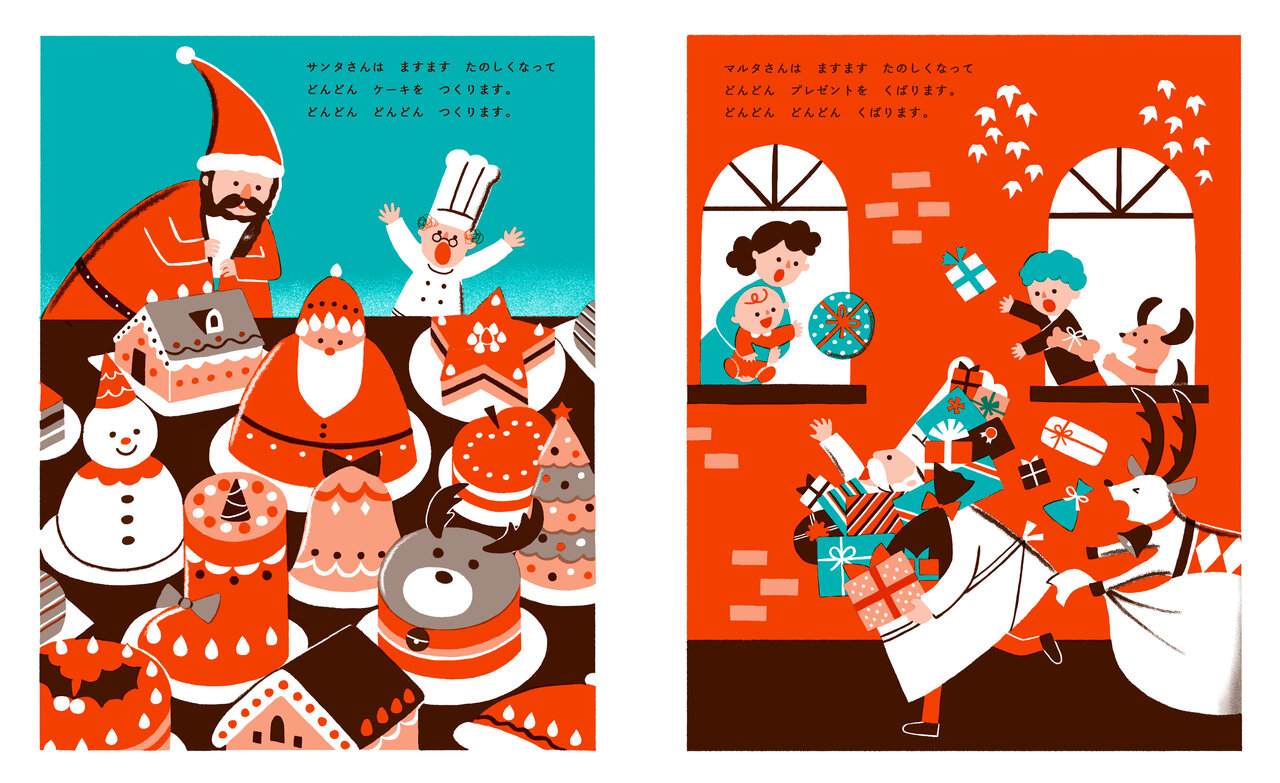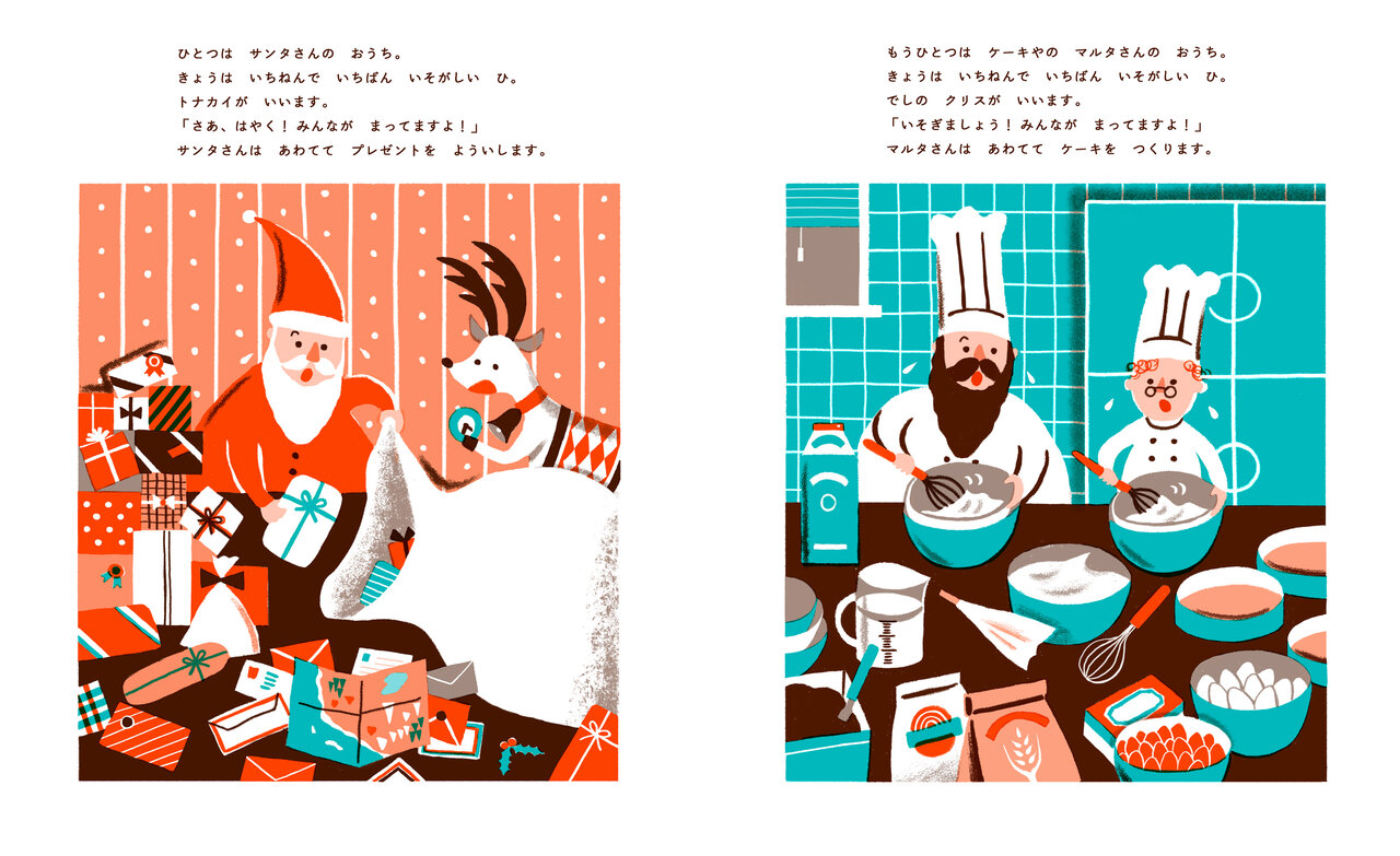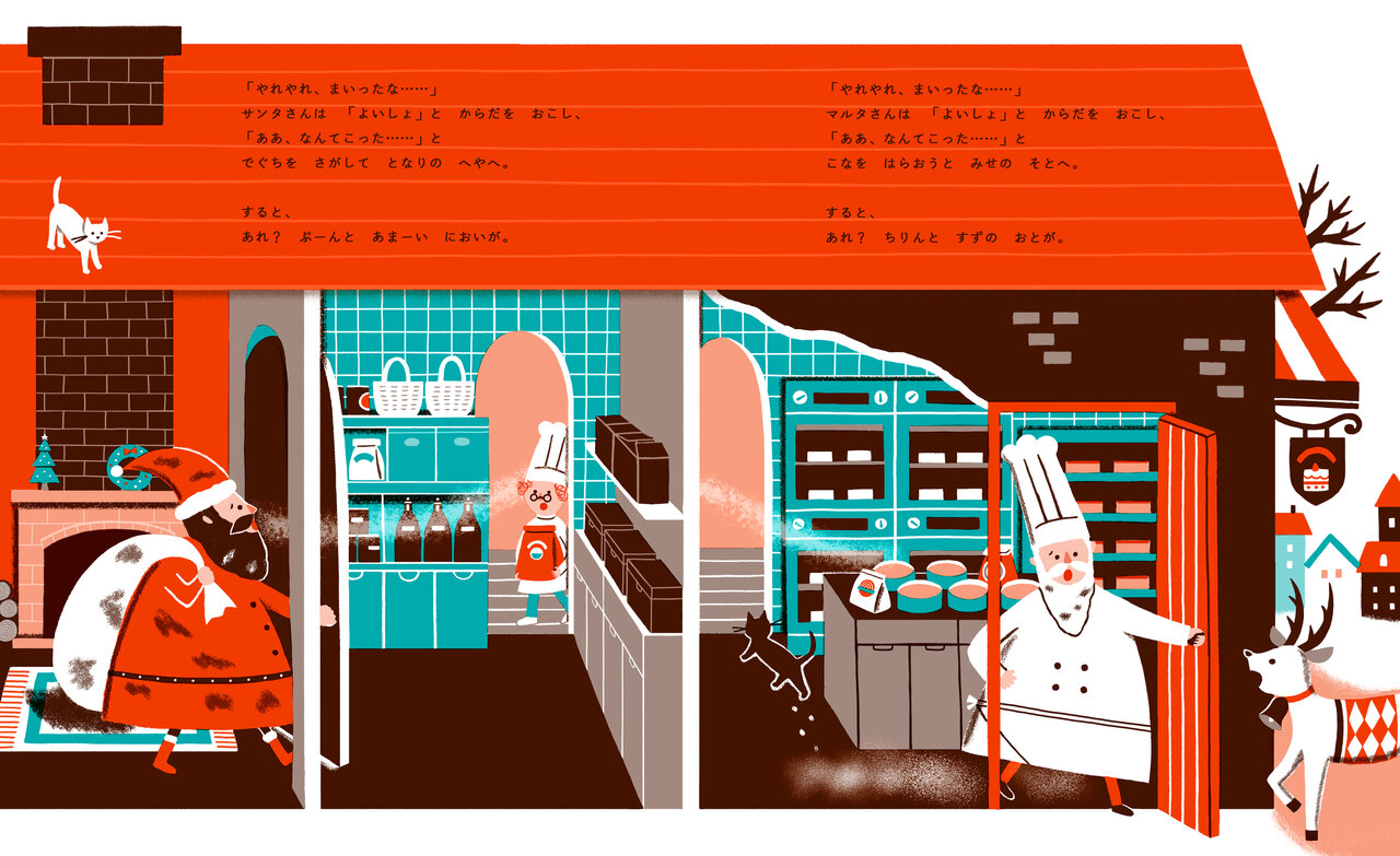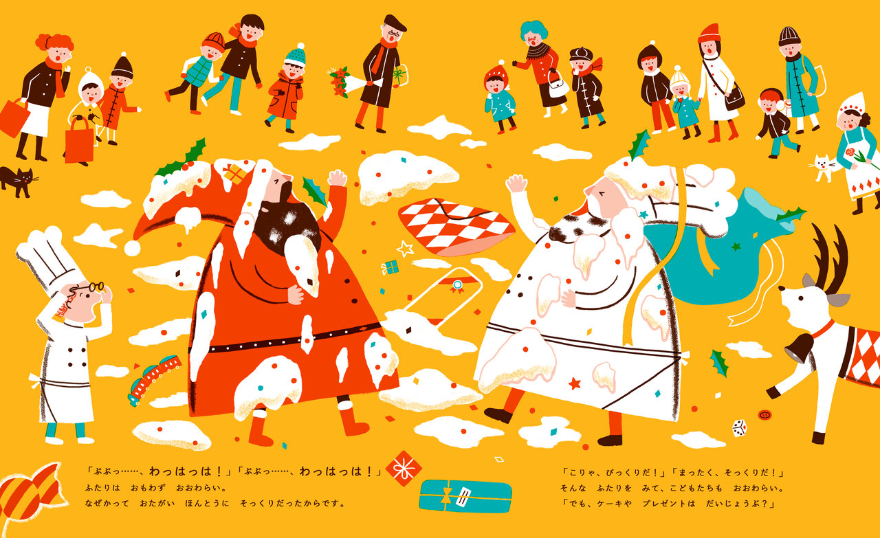 サンタさんはマルタさんにまちがえられ、マルタさんはサンタさんにまちがえられ……。クリスマスの前日に起こった、楽しいひと騒動。だからこの街には、サンタさんがふたり、ケーキ屋さんがふたりいるのです!