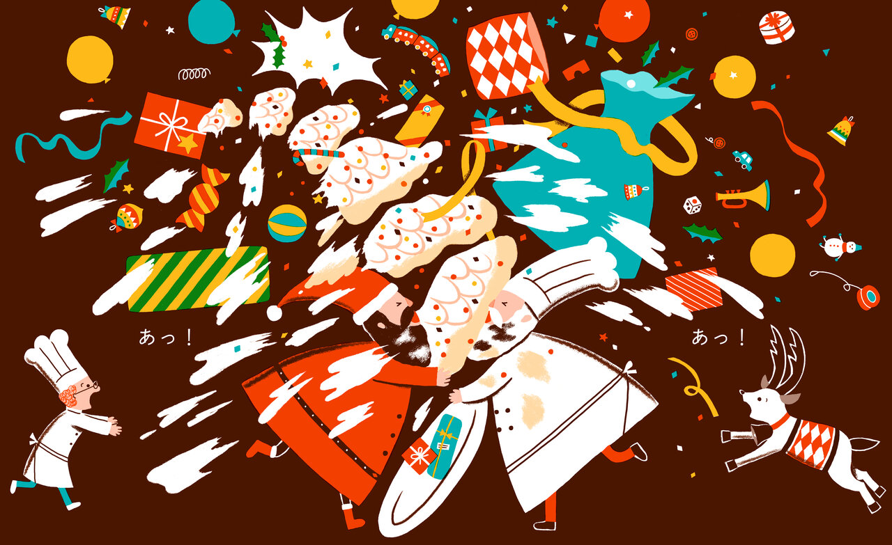 サンタさんが街じゅうにプレゼントを配っていると……、あっ!