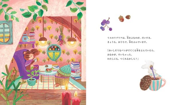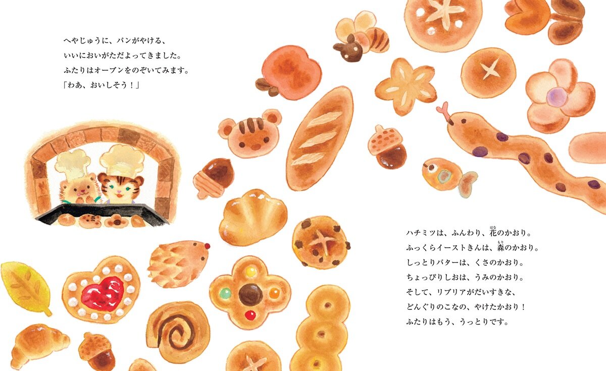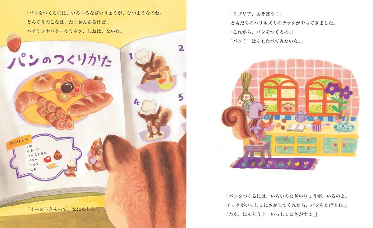リスのリブリアは、本に夢中な女の子。ある日、おいしそうなパンが出てくる本を読んでいるうちに、「わたしにも作れるかしら?」と、パン作りに興味を持ちます。なかよしのハリネズミのチックと一緒に、ハチミツ、ミルク、バター、イースト菌など、本に書いてある材料を探しに出かけるのです。