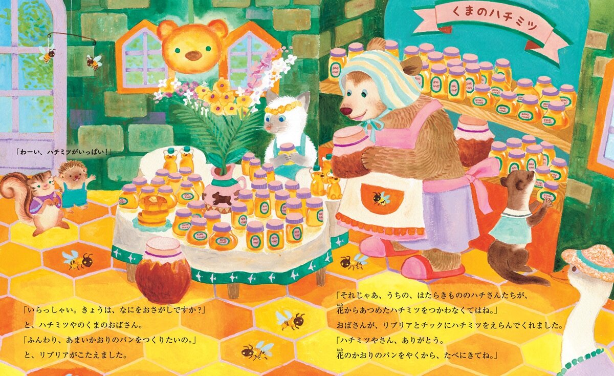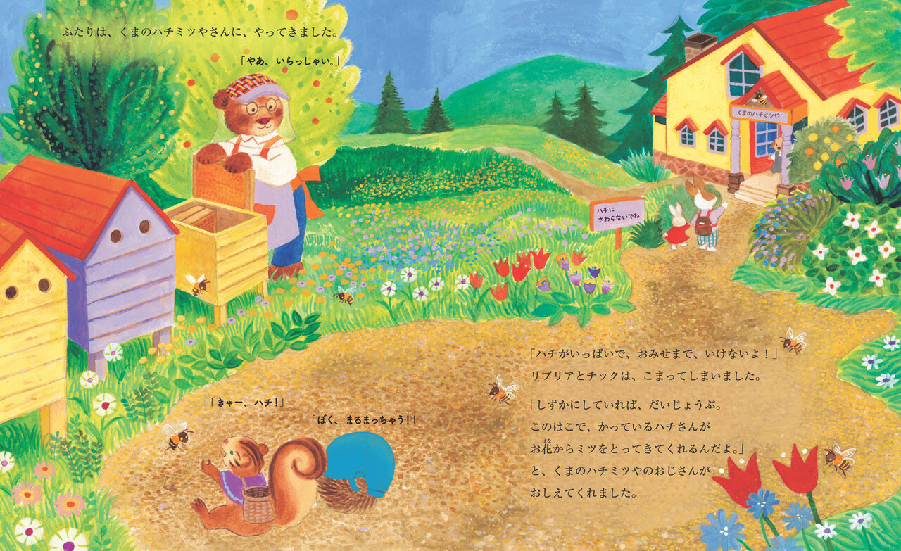 ハチミツを買いにいくリブリアと友だちのチック。ハチミツは、ハチが集めてくれているということを知ります。(『リブリアのパンづくり』より)