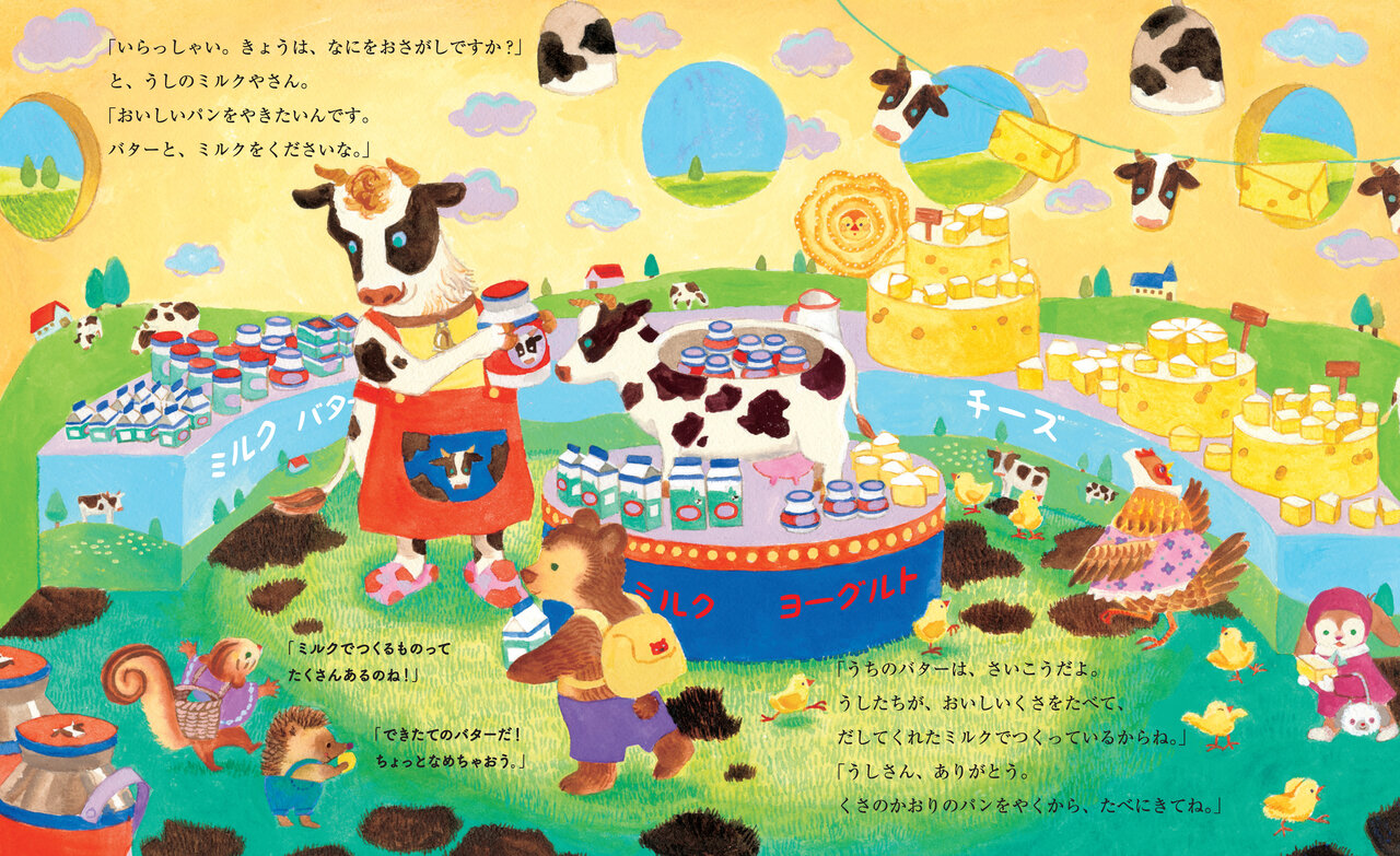 ミルクから作られるものはなにがあるかな?と話してみるのもいいですね。(『リブリアのパンづくり』より)