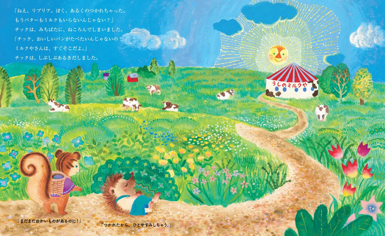 リブリアとチックは牧場にあるミルクやさんへも出かけます。買い物につかれちゃうこと、ありますよね。(『リブリアのパンづくり』より)
