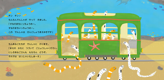 チンチン、カタコト、カタコトチン♪ ちんあなごたちを乗せたちんちんでんしゃが、海の中を走ります。ちんあなごたちは、どんなふうにでんしゃに乗っているのでしょう……?