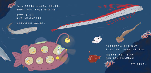 ちょっぴりこわがりなちんあなごたちが、潜水艇「チョウチンアンコウ号」に乗って、深海ツアーへ出発します。