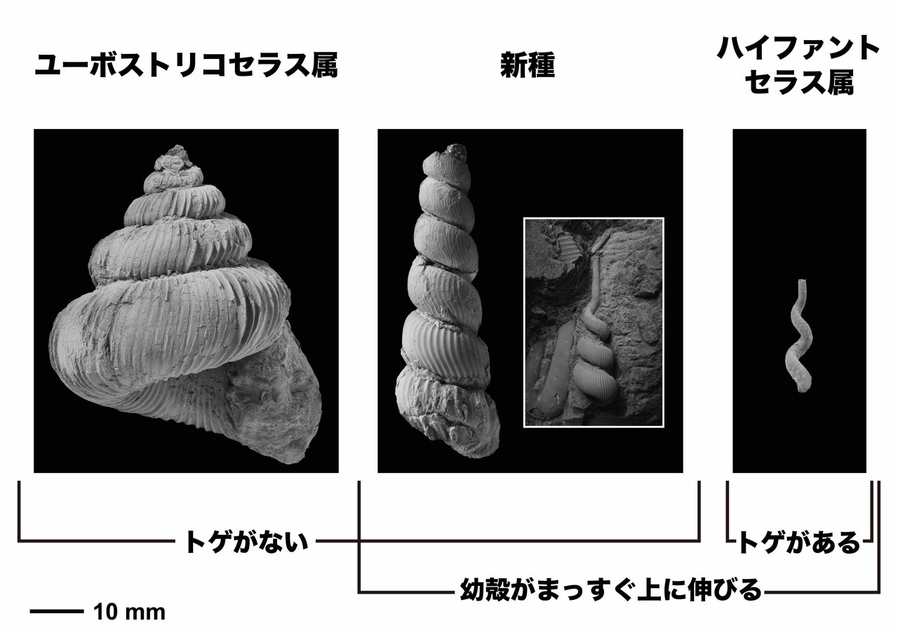 今回の新種を異常巻アンモナイトの中のどの属にするべきか、とても悩みました。それはこの新種が、複数の属にそれぞれ似ている部分を併せ持っていたためです。例えば、トゲがないということは、ユーボストリコセラス属というグループの特徴と同じですが、殻の先端(子どものときに作った部分)に注目すると、ハイファントセラス属にとてもよく似ています。また、それ以外にも似ているところがいくつかあります。しかし、ハイファントセラス属はトゲが4列あることがもっとも重要な特徴であり、それとは一致しません。
