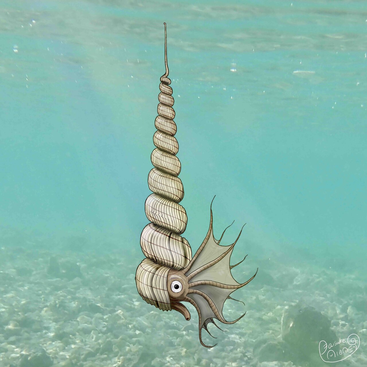 新種を含めた異常巻アンモナイトはあまり泳ぎが上手くなく、小さな生き物を吸うようにして食べる食性だったと考えられています。そのため、現在生きている頭足類のうち、似た生態をもつ深海に生きているタコのなかまの姿を参考にしています。