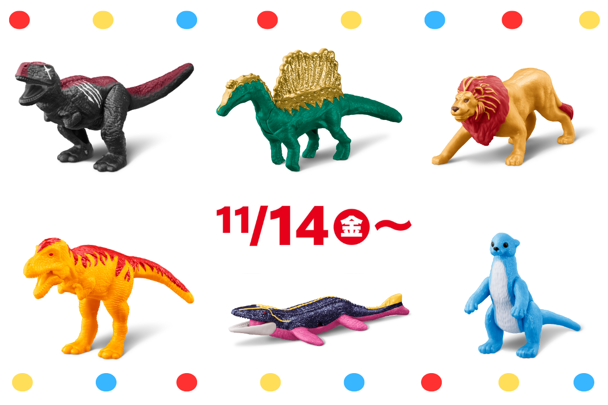 各キャラクターのポーズは、ハッピーセット限定のオリジナルデザイン。QRコードを読み込んで遊べるデジタルゲーム付きです。おもちゃの中からいずれか1つもらえます。 手足や口を動かして楽しめる全6種のおもちゃを、付属のカードとともにご紹介します!